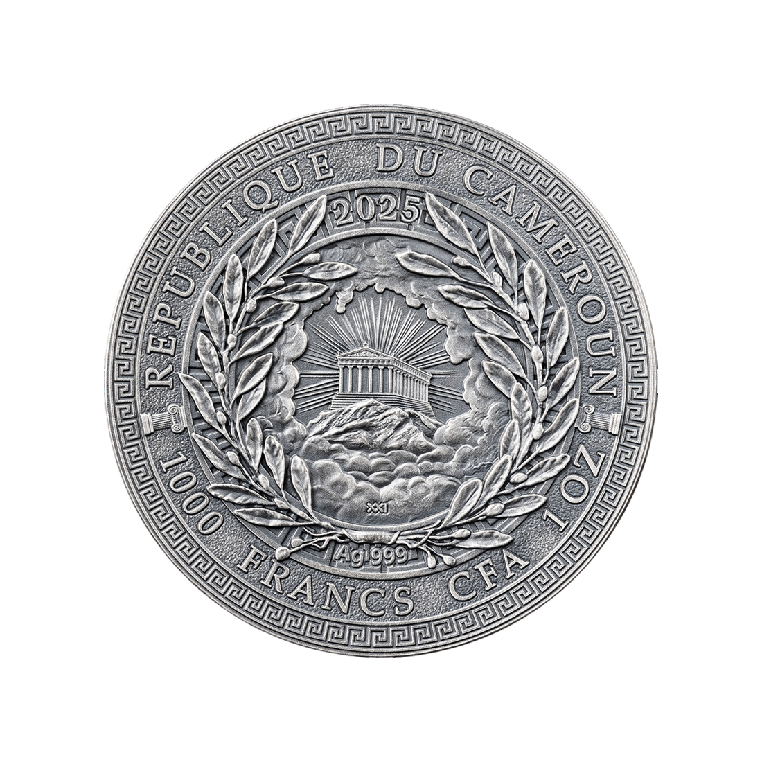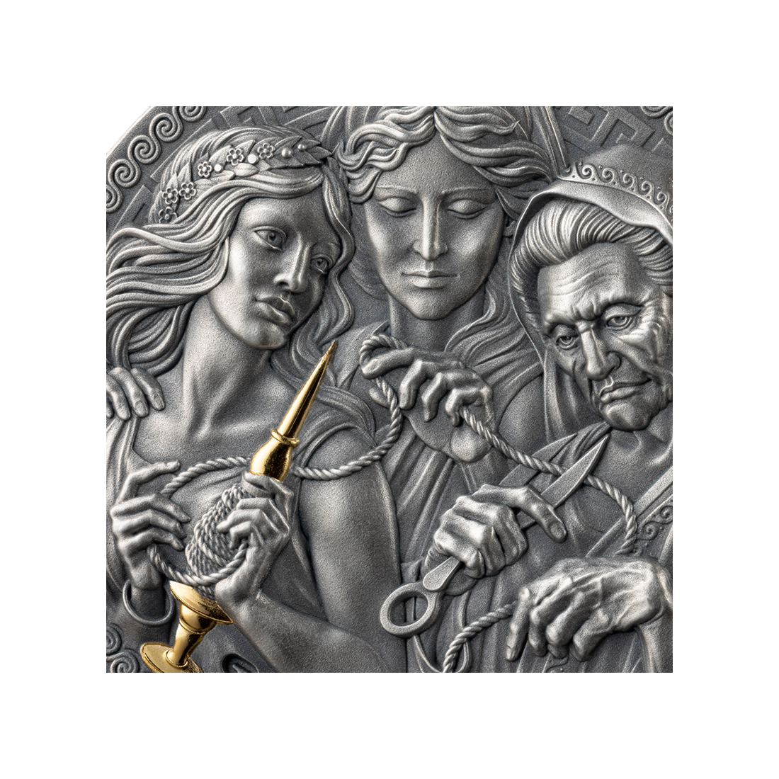 Rewers ukazuje trzy Mojry w pełnej ekspresji – Klothę przędącą nić życia, Lachesis mierzącą jej długość, Atropos przecinającą ją w odpowiednim momencie. Pozłacane elementy podkreślają ich boski charakter, a antyczne, mroczne wykończenie nadaje głębi i prestiżu. Awers z kolei zawiera nominał i herb kraju emisji – w tym przypadku Kamerunu – oraz informacje mennicze. Moneta posiada certyfikat autentyczności i eleganckie opakowanie gotowe do prezentacji.