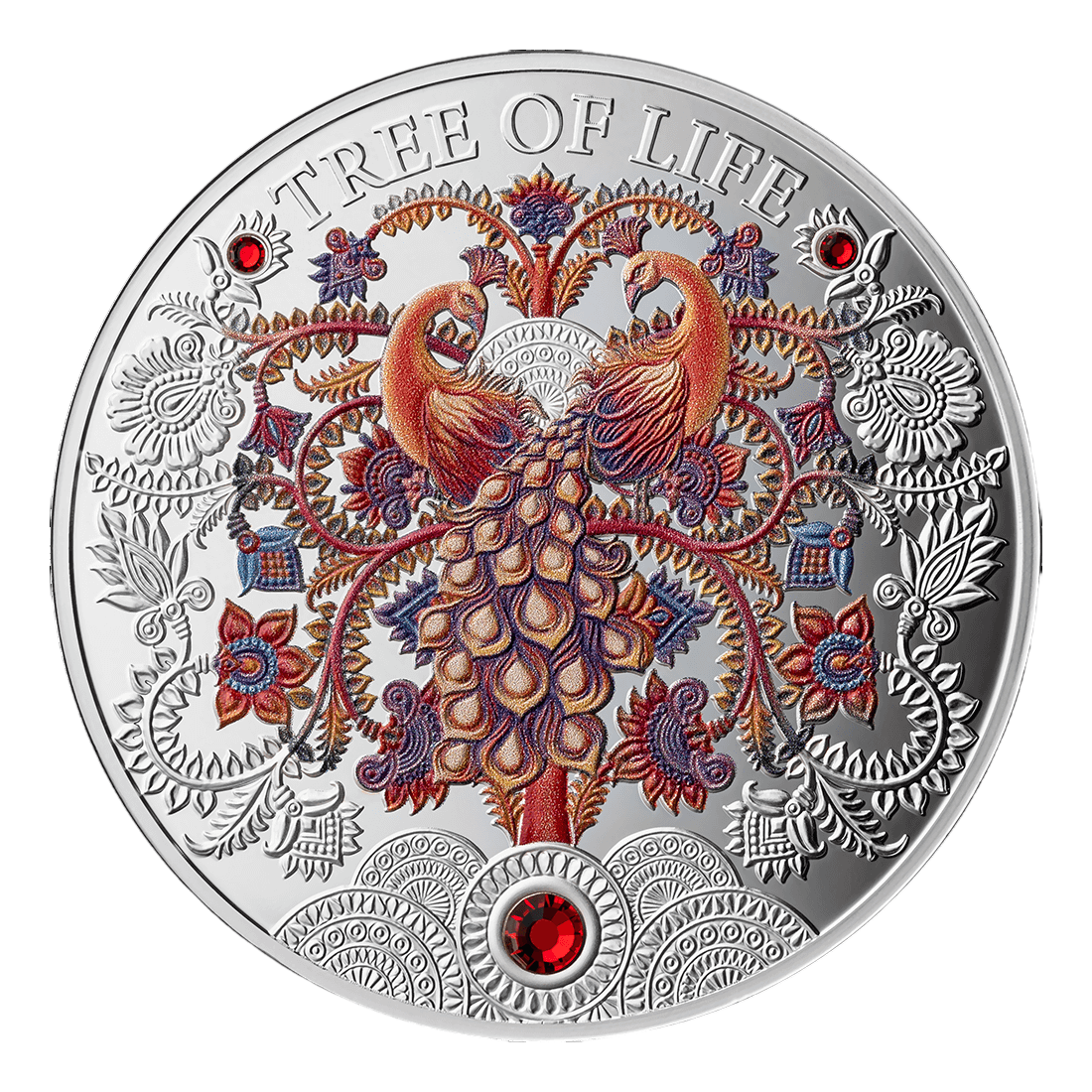 Projekt autorstwa MINT XXI zachwyca artystycznym połączeniem dwóch pawi splecionych koroną drzewa, którego gałęzie i liście przybierają ciepłe barwy jesieni – pomarańcze, purpury i czerwienie podkreślone zaawansowaną technologią druku cyfrowego. Kryształowy dodatek wkomponowany w motyw drzewa zwiększa efekt wizualny i prestiż monety. Symbolika drzewa życia opiera się na idei odrodzenia, długowieczności i harmonii między światem ziemi, nieba i życia duchowego.