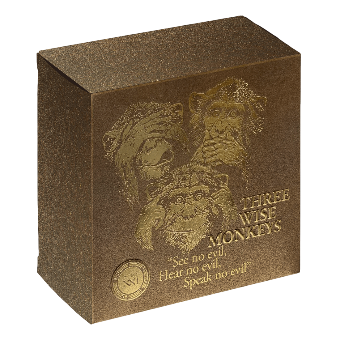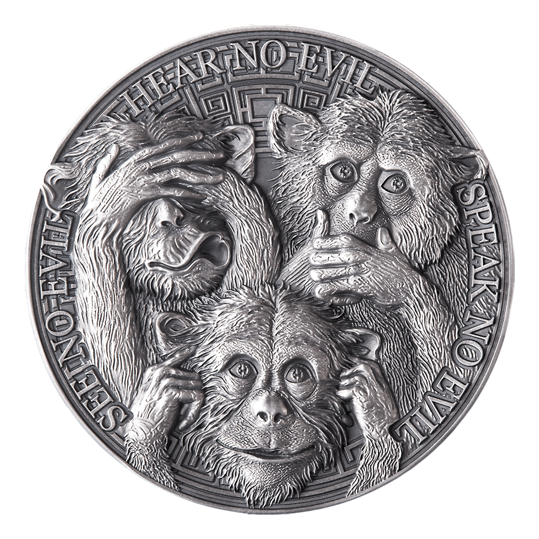 Trzy mądre małpki – Mizaru, Kikazaru i Iwazaru – są symbolem pochodzącym z japońskiej kultury, który zdobył popularność na całym świecie. Przedstawiają zasadę: „nie widzę zła, nie słyszę zła, nie mówię zła”. To filozofia oparta na samodyscyplinie i etyce, która przemawia do osób ceniących równowagę wewnętrzną, rozwagę i spokój ducha. Obraz trzech małpek w wysokim reliefie na rewersie monety został ukazany z dużą precyzją, oddając zarówno kunszt artystyczny, jak i głębię przesłania.