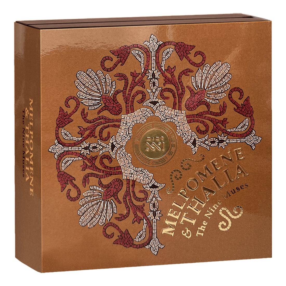 Kosztowny detal i technika wykonania zbliżają produkt do dzieła sztuki. Na rewersie widnieją maski tragiczna i komiczna w wysokim reliefie, tło zdobi cyfrowy druk przywodzący na myśl starożytne mozaiki. Awers zdobią detale pozłacane cyfrowo, subtelnie podkreślające symbole każdej z muz. Jakość „antique finish” nadaje patynowany, klasyczny wygląd, który przemawia do odbiorców ceniących historię i mitologię w numizmatyce.