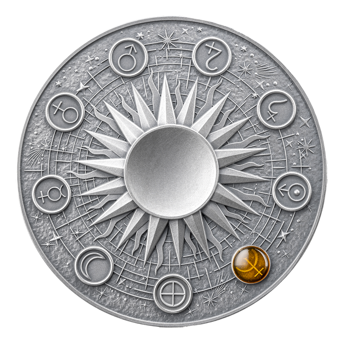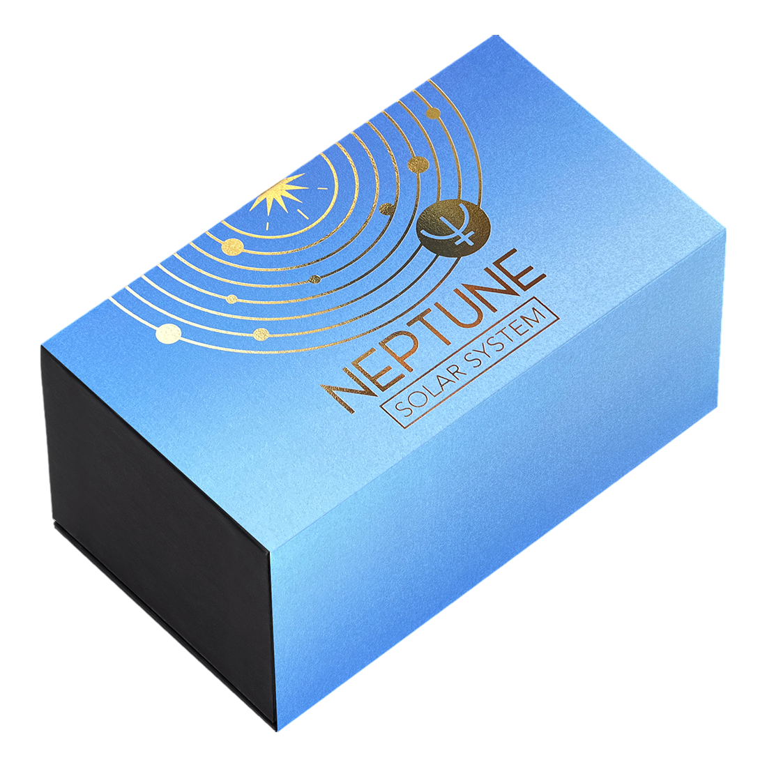 Na rewersie monety centralne miejsce zajmuje przestrzenny wizerunek Neptuna wykonany z kamienia półszlachetnego – niebieskiego kociego oka, umieszczonego na specjalnie wytłoczonej mapie Układu Słonecznego. Inkrustacja ta zachwyca efektem świetlnym przypominającym źrenicę kota, co nadaje monecie głębię i kosmiczny charakter. Tło rewersu wypełnione jest precyzyjnie odwzorowanymi orbitami oraz pozostałymi planetami.