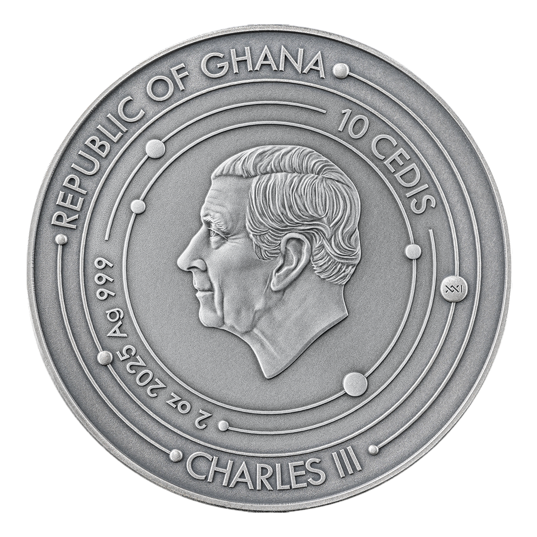 Awers przedstawia profil Jego Królewskiej Mości Karola III, wraz z oznaczeniami prawnymi: nominałem, wagą, próbą srebra, rokiem emisji oraz nazwą emitenta – Ghana. Całość dopełniona jest wykończeniem w technice wysokiego reliefu z antycznym wykończeniem powierzchni, co zapewnia doskonałą czytelność detali.