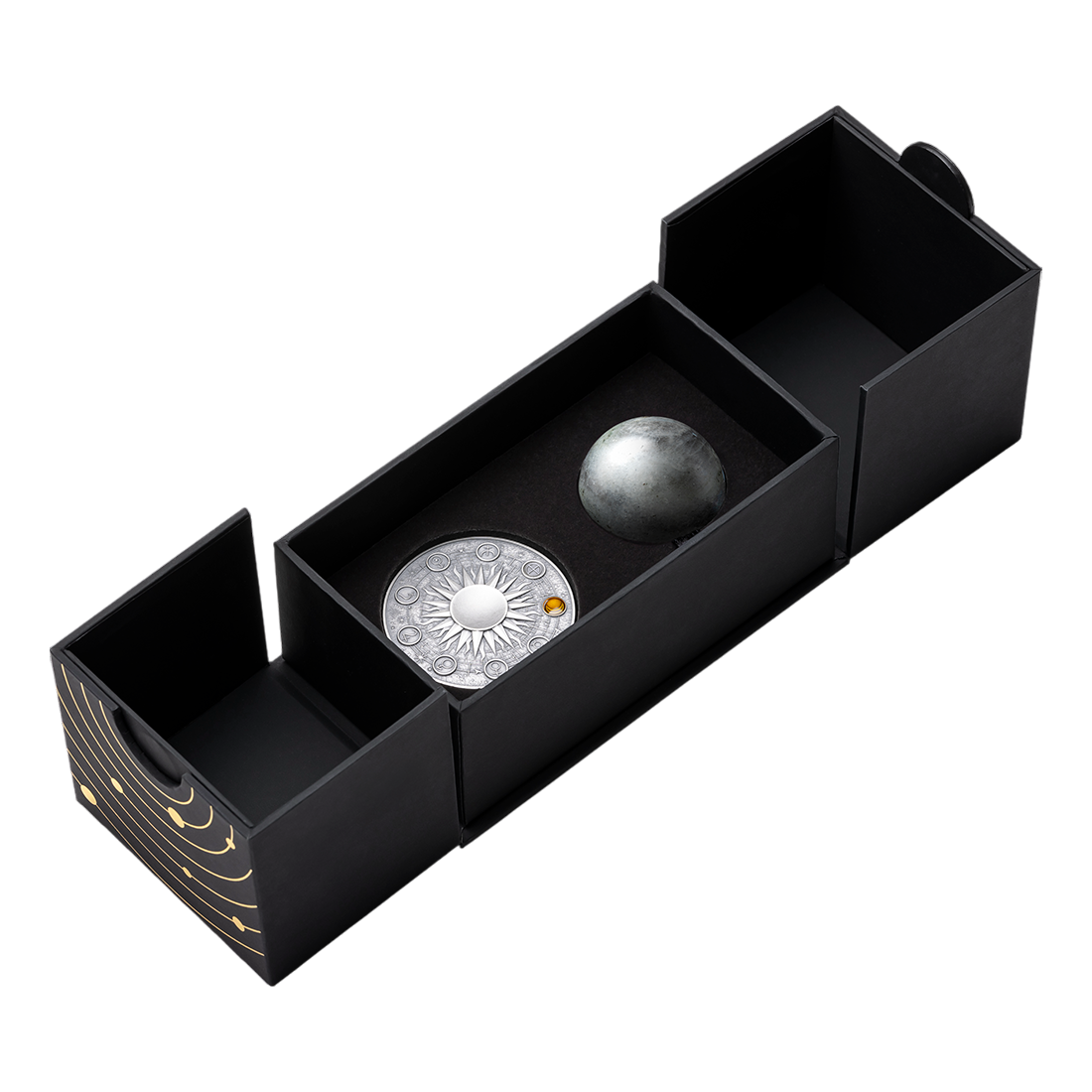 Srebrna moneta Układ słoneczny: Księżyc 2025 2 uncje została wybita ze srebra próby 999 w masie 62,2 grama. Średnica monety wynosi około 50 mm, co daje odpowiednią przestrzeń do przedstawienia bogatego w detale wzoru. Wykończenie typu antique nadaje powierzchni postarzanego charakteru, co podkreśla fakturę Księżyca i tworzy wrażenie głębi. Każdy egzemplarz zapakowany jest w eleganckie pudełko oraz opatrzony certyfikatem autentyczności, potwierdzającym dane techniczne i pochodzenie emisji.
