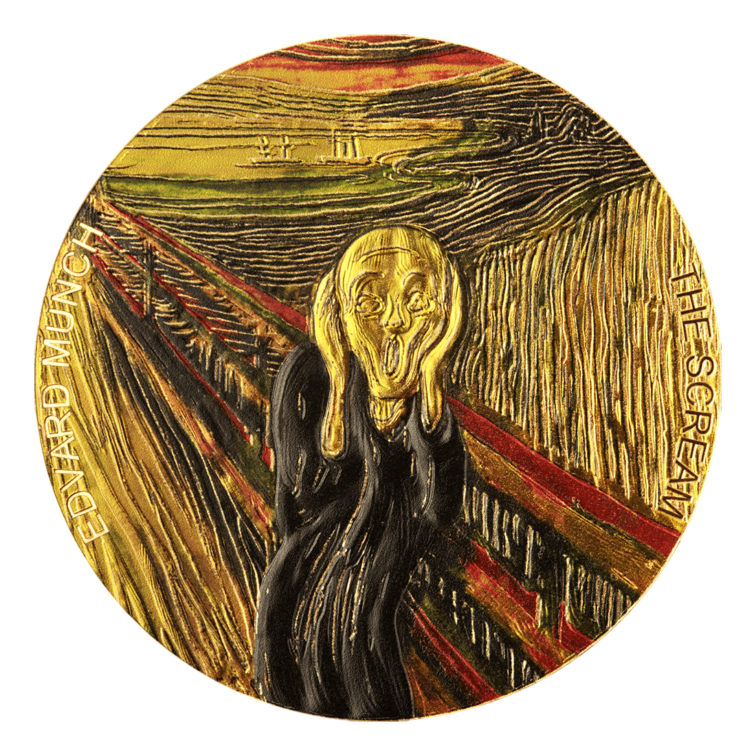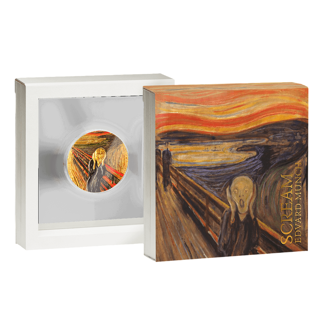 Wizerunek „Krzyku” został odwzorowany z wyjątkową precyzją. Wysoki relief oraz selektywne złocenie podkreślają dramatyzm sceny, oddając emocje zawarte w oryginalnym obrazie Muncha. Każdy detal – od wyrazu twarzy postaci, przez dynamiczne tło, po efektowną kompozycję – został starannie dopracowany. Moneta ta stanowi nie tylko lokatę kapitału, ale też małe dzieło sztuki użytkowej, które można podziwiać na co dzień.