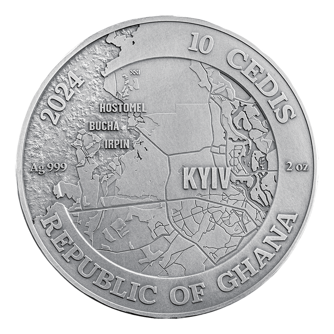 Moneta „Bitwa o Kijów 2024” to prestiżowy numizmat o wadze 2 uncji (62,2 g) czystego srebra próby 0,999, wybita przez Mint XXI z wykończeniem antiqued finish i wysokim reliefem, dostępna z nominałem 10 cedis (Ghana) – wyjątkowa propozycja zarówno dla inwestorów, jak i kolekcjonerów.