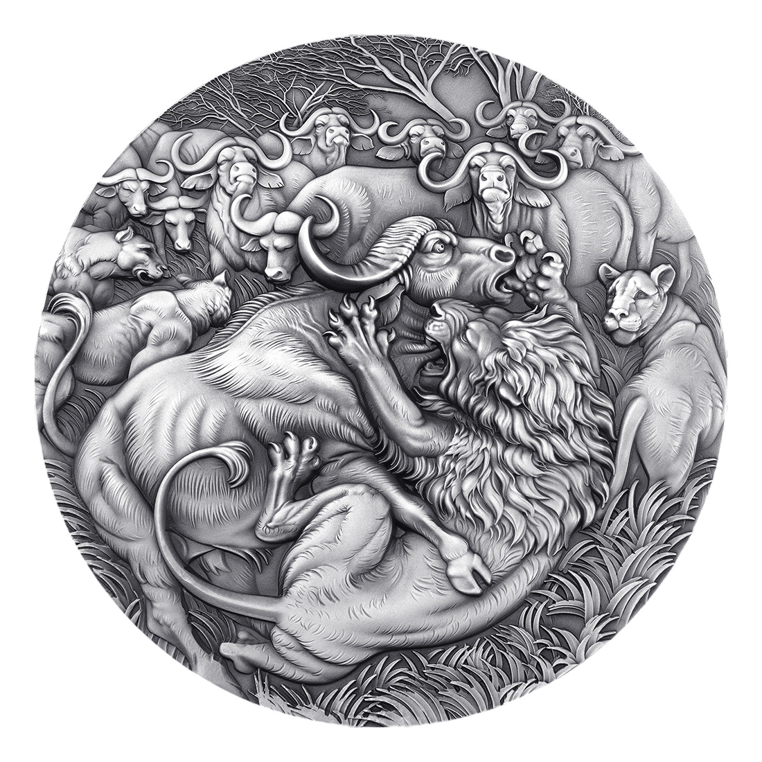 Projekt monety ukazuje dramatyczną, a zarazem symboliczną scenę wielkiego polowania. Dynamiczna kompozycja prezentuje drapieżniki ścigające swoje ofiary na tle sawanny – lwy, lamparty oraz antylopy w ruchu, uchwycone w realistycznym stylu i wysokim reliefie. Scena odzwierciedla naturalny porządek życia – narodziny, przetrwanie i śmierć – wszystko to zamknięte w jedynym kręgu natury. Detale zostały dopracowane z niezwykłą precyzją, a dzięki zastosowaniu techniki ręcznego polerowania każdy element ma trójwymiarową głębię i wyrazistość.