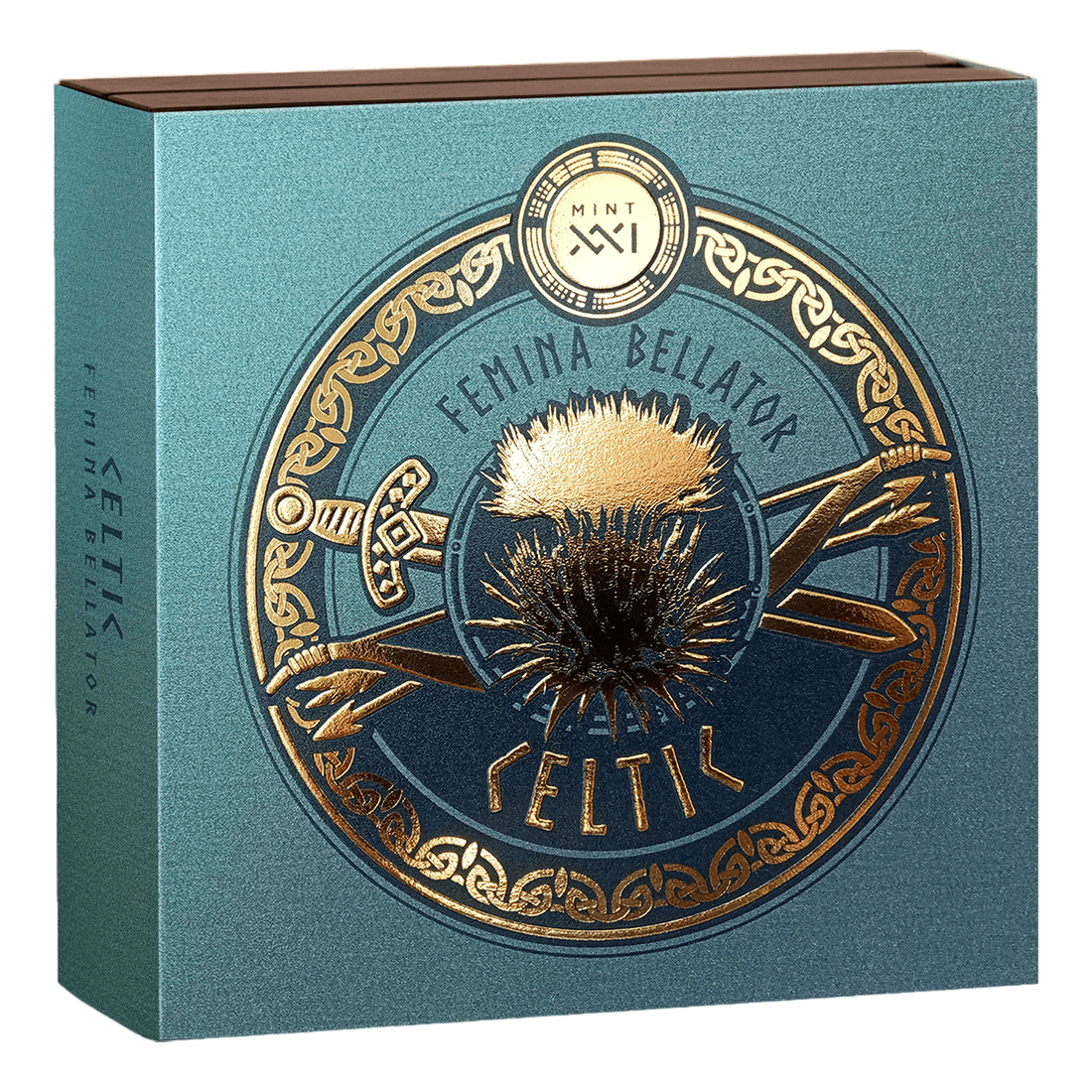 Moneta Celtic z prestiżowej serii Femina Bellator oddaje hołd kobietom walczącym wśród dawnych celtyckich plemion. Ukazana z włócznią, w dynamicznej pozie i z wyrazem skupienia na twarzy, kobieta-wojowniczka symbolizuje niezłomność, dumę i gotowość do walki o swoje wartości. Charakterystyczny zielony awenturyn umieszczony w jej tiarze nie tylko dodaje elegancji, ale również symbolizuje ochronę i równowagę – cechy przypisywane tej odmianie kwarcu w kulturze Celtów. Detale zbroi, ornamenty i cyfrowe barwienie włosów tworzą spójną, silną wizję wojowniczki, która łączy piękno z siłą.