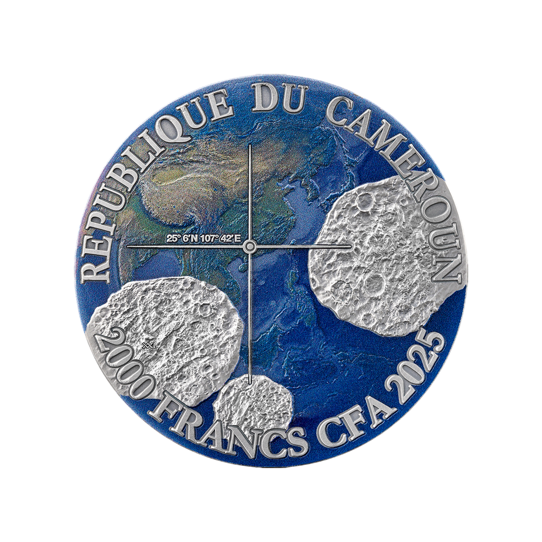 Moneta na rewersie posiada autentyczny fragment meteorytu umieszczony centralnie, otoczony efektem wizualnym przypominającym krater uderzeniowy. Na górze rewersu znajduje się nazwa meteorytu, na dole zaś kraj i rok upadku. Awers przedstawia fragment globu z zaznaczonym miejscem upadku meteorytu wraz z precyzyjnymi współrzędnymi geograficznymi. Wokół widnieje nazwa kraju emitenta – Kamerun, nominał i rok emisji. Całość stanowi harmonijne połączenie naukowej precyzji z eleganckim wzornictwem.