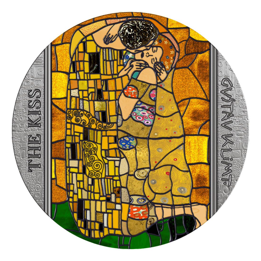 Centralnym punktem monety jest scena ukazująca dwoje kochanków w czułym uścisku – jeden z najbardziej rozpoznawalnych motywów secesyjnego malarstwa Klimta. Detale zostały wydobyte za pomocą wysokiego reliefu, co w połączeniu z kolorowym nadrukiem daje wrażenie głębi i faktury. Tło przypomina klasyczny witraż, który symbolizuje światło, duchowość i nieprzemijającą wartość sztuki. Dzięki temu moneta przyciąga nie tylko inwestorów, ale i miłośników sztuki z całego świata.