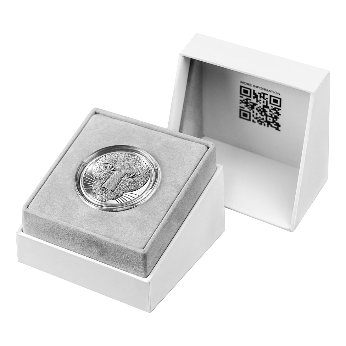 Profil pumy wykonany jest z warstwowych elementów binarnych, które tworzą hipnotyczny wzór powtarzających się cyfr, nadając projektowi głębię i nowoczesny charakter. Wyrazisty, symetryczny wizerunek drapieżnika w jakości proof daje efekt trójwymiarowości, a każda linia i szczegół są idealnie wykończone. Rewers uzupełnia holograficzna tarcza, ozdobiona kodem QR – unikalnym i pełniącym funkcję portfela kryptowalutowego – oraz herbowym motywem ze smokiem i jednorożcem, co nadaje monecie aurę bezpieczeństwa i ekskluzywności.