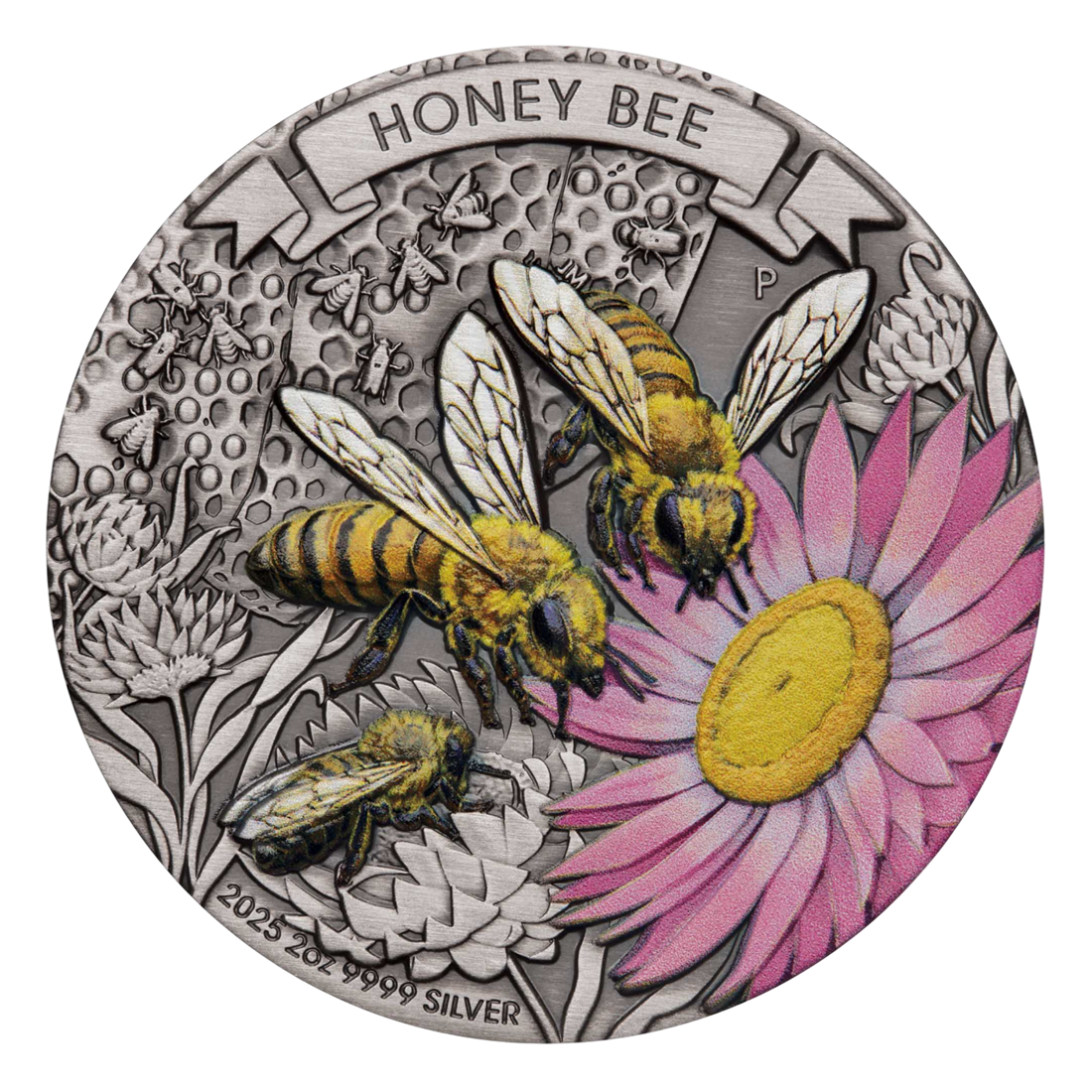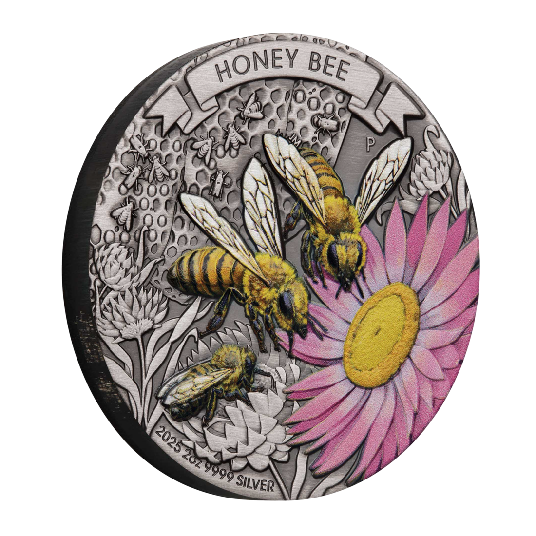 Na rewersie widnieje artystyczne przedstawienie dwóch pszczół zbierających nektar z kwitnącej margerytki. Kompozycja została wzbogacona o subtelne detale uli i kwiatów, a także wstęgę z napisem „HONEY BEE”. Dodatkowo umieszczono tu informacje o masie, próbie srebra, roku emisji oraz znak mennicy Perth Mint. Awers zdobi oficjalny portret Jego Królewskiej Mości Karola III autorstwa Dana Thorne’a wraz z nominałem. Każda sztuka została indywidualnie wykończona techniką postarzenia, dzięki czemu posiada niepowtarzalny charakter.