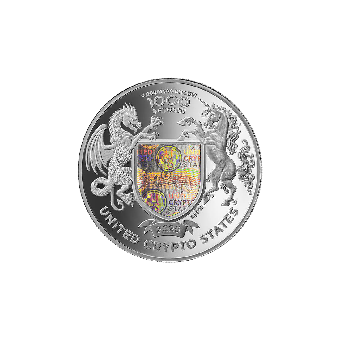 Awers numizmatu zdobi herb z hologramem oraz kodem QR prowadzącym do portfela kryptowalutowego. To przełomowe rozwiązanie w świecie numizmatyki, które łączy materialne srebro z cyfrowym ekosystemem. Po obu stronach herbu umieszczono symboliczne postacie – smoka i jednorożca – które symbolizują połączenie świata realnego z wirtualnym. Nominał „1000 SATOSHI” uwieczniony na monecie podkreśla silny związek z rynkiem kryptowalut.
