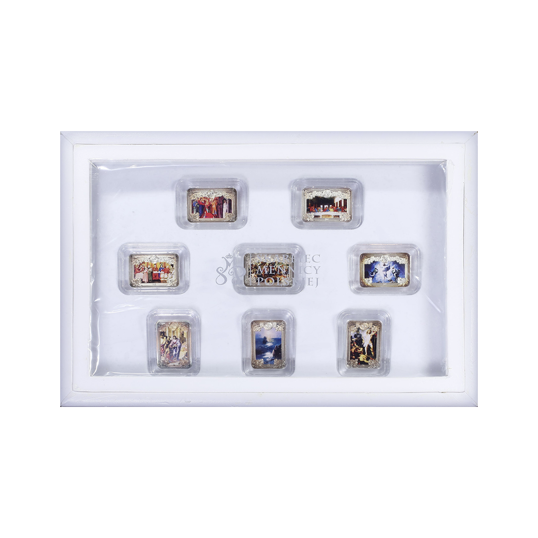 Kolekcja składa się z ośmiu sztabek, z których każda przedstawia kluczowy moment z życia Jezusa Chrystusa, zainspirowany dziełami znanych malarzy. Sceny ukazane na sztabkach obejmują „Wskrzeszenie Łazarza”, „Ostatnią Wieczerzę”, „Cudowne Rozmnożenie Chleba”, „Cud w Kanie Galilejskiej”, „Przemienienie Pańskie”, „Uzdrowienie Niewidomego”, „Jezusa chodzącego po wodzie” oraz „Zmartwychwstanie”. Każda sztabka jest oddzielnym dziełem numizmatycznym, które łączy w sobie walory artystyczne i religijne, umożliwiając kolekcjonerom i miłośnikom sztuki głębsze obcowanie z ikonografią chrześcijańską. Całość została starannie umieszczona w oryginalnym pudełku, które prezentuje zestaw w eleganckiej, uporządkowanej formie, podkreślając jego charakter kolekcjonerski i wartościowy zarówno dla numizmatyków, jak i osób zainteresowanych sztuką sakralną.