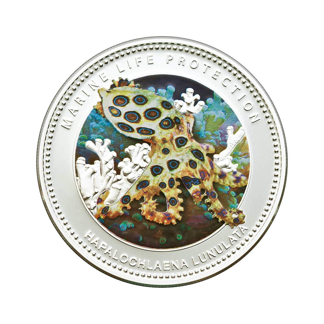 Srebrna moneta, która ma na celu zwrócenie uwagi na zagrożenia dla oceanów i ochronę ich ekosystemów. Przedstawia ośmiornicę błękitnooką, jedno z najbardziej jadowitych zwierząt morskich, znane z charakterystycznych niebieskich pierścieni. Numizmat jest dedykowany kolekcjonerom tematycznych monet, miłośnikom przyrody oraz osobom zainteresowanym ochroną środowiska morskiego. Emisja stanowi część uznanej serii Marine Life Protection, która promuje świadomość ekologiczną i potrzebę zachowania różnorodności biologicznej mórz. Moneta symbolizuje delikatną równowagę pomiędzy pięknem natury a odpowiedzialnością człowieka za jej przyszłość.