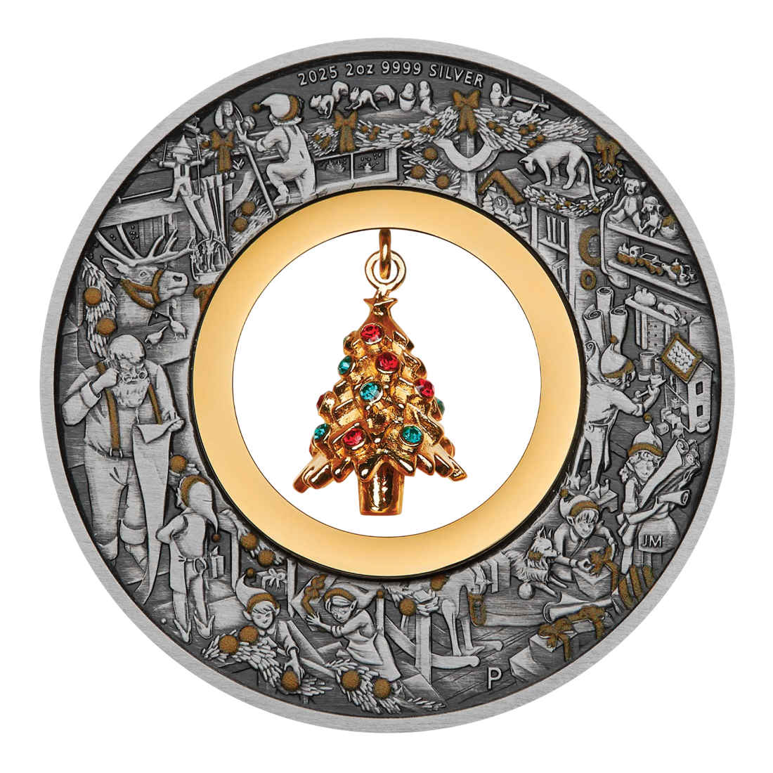 Moneta o masie dwóch uncji srebra o czystości 99,99% wyróżnia się innowacyjnym wykończeniem, które znacząco podnosi jej wartość. Zastosowanie techniki antycznego wykończenia (Antique Finish) nadaje srebru głębię i teksturę, która naśladuje patynę czasu, jednocześnie podkreślając każdy detal misternego projektu. Centralny element rewersu, przedstawiający magiczny warsztat Mikołaja, został dodatkowo wzbogacony o selektywną koloryzację, tworząc żywy i bajkowy obraz. Ten kontrast między postarzanym srebrem a żywymi kolorami sprawia, że walor jest prawdziwym dziełem sztuki i zwiększa jego atrakcyjność dla globalnej społeczności numizmatycznej. Rewers, zaprojektowany przez Jennifer McKenna, ukazuje bogatą scenę, która przywołuje świąteczne wspomnienia i emocje, co ma niebagatelne znaczenie przy tworzeniu wartości sentymentalnej i kolekcjonerskiej. Awers zdobi wizerunek Jego Królewskiej Mości Króla Karola III, zaprojektowany przez Dana Thorne’a. Moneta dostarczana jest w luksusowym, pudełku prezentowym, do którego dołączony jest numerowany certyfikat autentyczności, co dodatkowo zabezpiecza jej rynkowy potencjał.