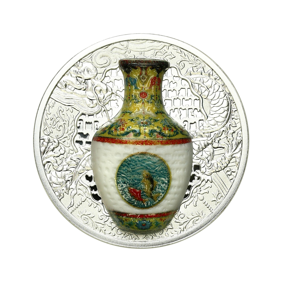 Wysmakowany numizmat, w którym połączono elegancję i głębokie odniesienia kulturowe, co sprawia, że staje się zarówno przedmiotem kolekcjonerskim, jak i wyrazem szacunku dla sztuki orientalnej. Na rewersie dominuje centralnie umieszczony motyw wazonu z czasów dynastii Qing - waza wyniesiona na pierwszy plan, otoczona precyzyjnie wykonanymi detalami symboliki chińskiej, w tle subtelna tekstura inspirowana ornamentyką i wystylizowanym smokiem, co nadaje kompozycji głębi i artystycznej intensywności. Awers przedstawia profilową podobiznę królowej Elżbiety II, osadzoną w klasycznej ramie numizmatycznej. Wokół znajduje się gładki pierścień z inskrypcjami państwa emisji i roku wydania, co w połączeniu z wyważoną kompozycją nadaje całej strukturze dostojności i spójności.