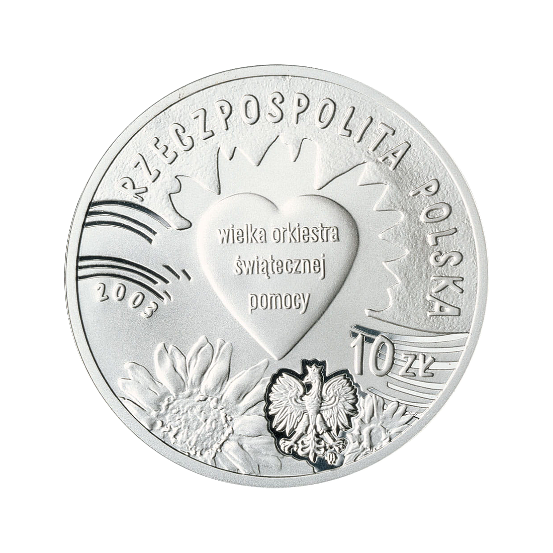 Wydanie w 2003 roku upamiętnia dziesięciolecie działalności Wielkiej Orkiestry Świątecznej Pomocy, jednej z najbardziej rozpoznawalnych i wpływowych organizacji charytatywnych w Polsce. Celem było uhonorowanie wkładu WOŚP w rozwój opieki medycznej, szczególnie pediatrycznej i geriatrycznej, oraz promowanie idei solidarności społecznej i bezinteresownej pomocy potrzebującym. Emisja pełniła zarówno funkcję kolekcjonerską, jak i edukacyjną, przypominając społeczeństwu o znaczeniu aktywności obywatelskiej oraz roli organizacji pozarządowych w kształtowaniu pozytywnych zmian społecznych. W ten sposób numizmat stał się symbolem jubileuszu oraz hołdem dla wszystkich osób wspierających inicjatywy WOŚP na przestrzeni pierwszych dziesięciu lat jej działalności.