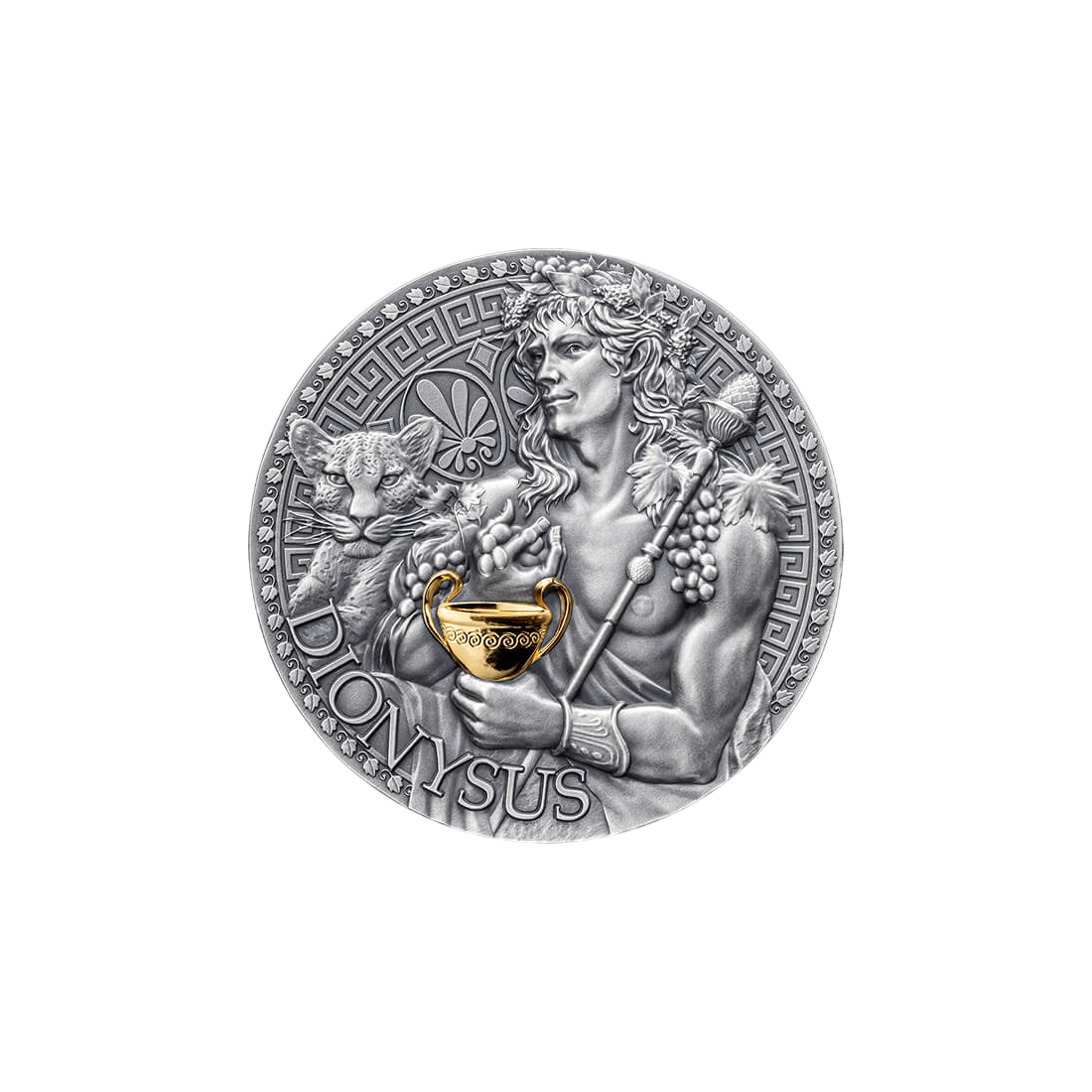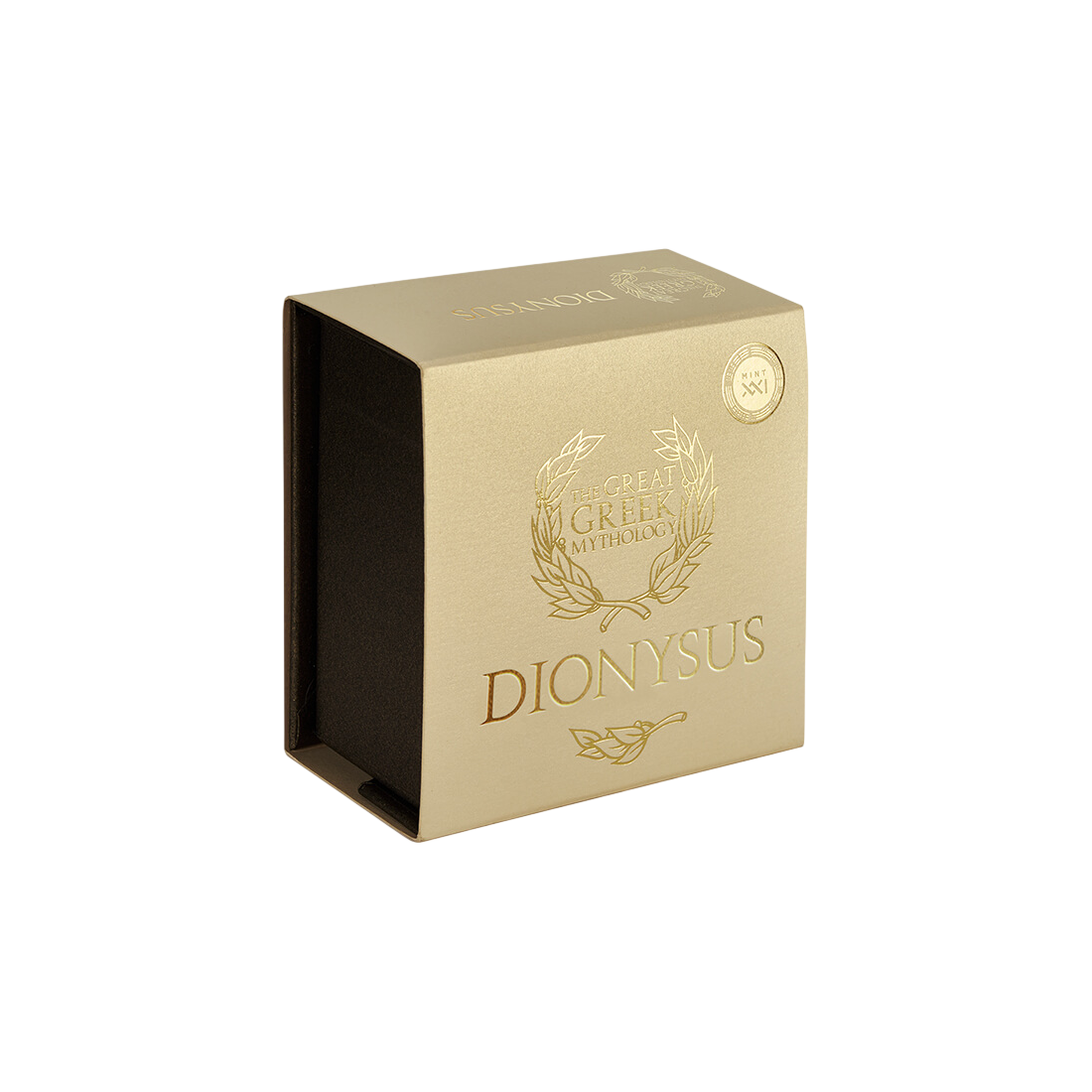Dionizos, grecki bóg wina, płodności i ekstatycznych uroczystości, uosabia na monecie ducha nieokiełznanej radości i boskiego szału. Projekt awersu i rewersu został wykonany w technice High Relief, co nadaje postaciom niesamowitą głębię i trójwymiarowość, wydobywając każdy detal sceny. Dionizos przedstawiony w towarzystwie majestatycznej pantery, symbolu jego dzikiej mocy, wznosi kielich, który – dzięki selektywnemu złoceniu – mieni się na tle patynowanej powierzchni, akcentując bogactwo doznań. Z perspektywy inwestycyjnej, monety charakteryzujące się tak zaawansowanymi technikami zdobienia (wysoki relief, oksydowanie, selektywne pozłacanie) oraz należące do popularnych serii tematycznych, często osiągają znaczne premie na rynku wtórnym. Ograniczony do 500 egzemplarzy nakład sugeruje szybkie wyczerpanie zapasów i gwarantuje, że jest to pozycja pożądana przez najbardziej wymagających numizmatyków.