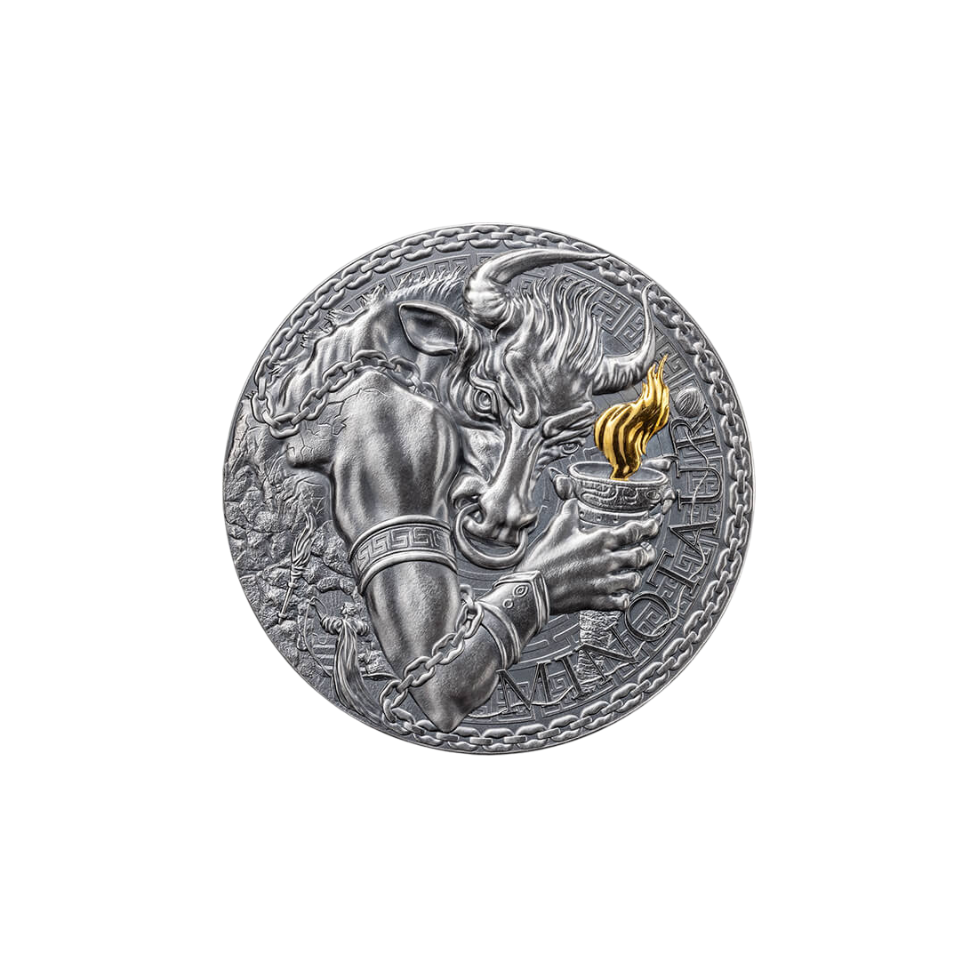 Wykonanie monety Minotaur to prawdziwy majstersztyk menniczy. Awers i rewers zostały wybite z wykorzystaniem techniki wysokiego reliefu (High Relief), co nadaje im trójwymiarową głębię i dramatyzm, idealnie oddając bestialską siłę Minotaura – pół-człowieka, pół-byka, uwięzionego w Labiryncie. Tekstura Antique Finish (postarzane wykończenie) podkreśla starożytny charakter mitu, co jest niezwykle cenione przez numizmatyków. Selektywne złocenie (Selective Gilding) zastosowano w kluczowych elementach, podnosząc estetyczną wartość monety. Połączenie srebra i złota w tak limitowanej edycji jest cechą charakterystyczną dla monet premium, które notują najwyższe wskaźniki wzrostu cen na rynku wtórnym. Te techniki stanowią świadectwo najwyższej jakości rzemiosła.