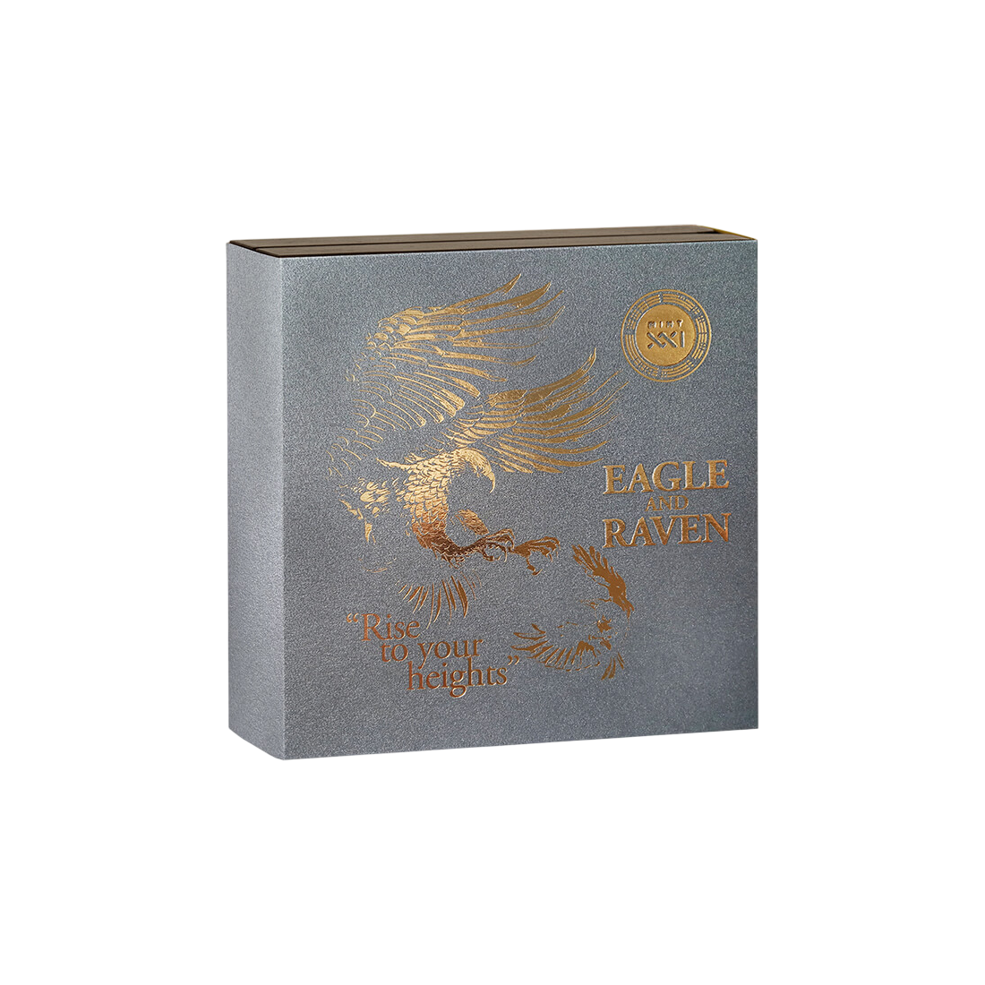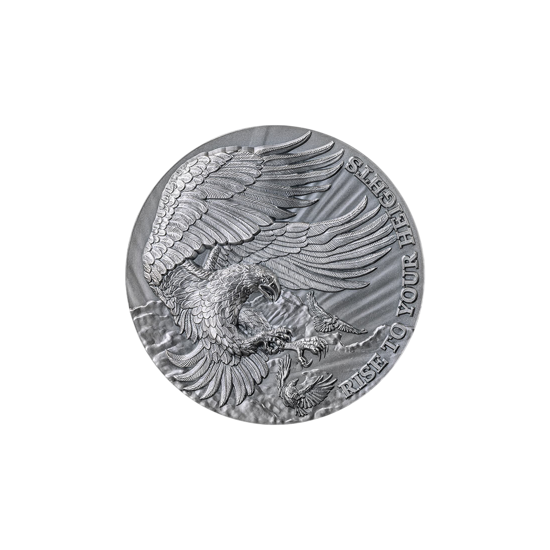 Rewers monety przedstawia intrygującą i dynamiczną scenę: majestatyczny orzeł wznosi się ku niebu, ignorując kruka, który usiłuje go powstrzymać. Ta narracyjna rzeźba w metalu doskonale ilustruje motto serii: „Rise to your heights” („Wznieś się na swoje wyżyny”). Jest to przesłanie idealnie wpisujące się w mentalność skutecznego inwestora – niezłomność, skupienie i wznoszenie się ponad codzienne trudności rynkowe. Zastosowanie techniki ekstremalnie wysokiego reliefu sprawia, że wizerunki ptaków nabierają imponującej trójwymiarowości, zamieniając monetę w małą, numizmatyczną rzeźbę. Całość została mistrzowsko wykończona antycznym patynowaniem (Antique Finish), co podkreśla detale i nadaje walorowi charakter cennej, historycznej pamiątki, maksymalizując jego atrakcyjność wizualną i kolekcjonerską.