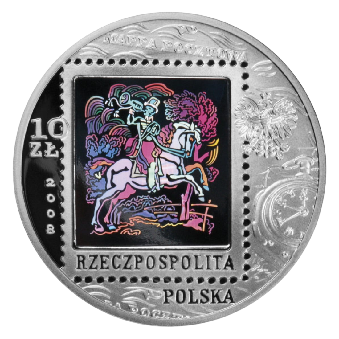 Moneta upamiętnia jedno z najstarszych przedsiębiorstw w Polsce, którego korzenie sięgają XVI wieku. Projekt rewersu przenosi nas w czasy dawnej komunikacji, prezentując postać gońca pocztowego na tle XVII-wiecznego miedziorytu z wizerunkiem zajazdu. To nawiązanie do tradycji i trwałości instytucji, która przez stulecia łączyła Polaków. Z kolei awers monety zachwyca nowoczesnym akcentem – umieszczono na nim hologram przedstawiający znaczek pocztowy. Dzięki zastosowaniu efektu kątowego, drzewa widoczne na znaczku zmieniają barwę, co nadaje numizmatowi unikalnego charakteru i dodatkowo zabezpiecza go przed fałszerstwem.