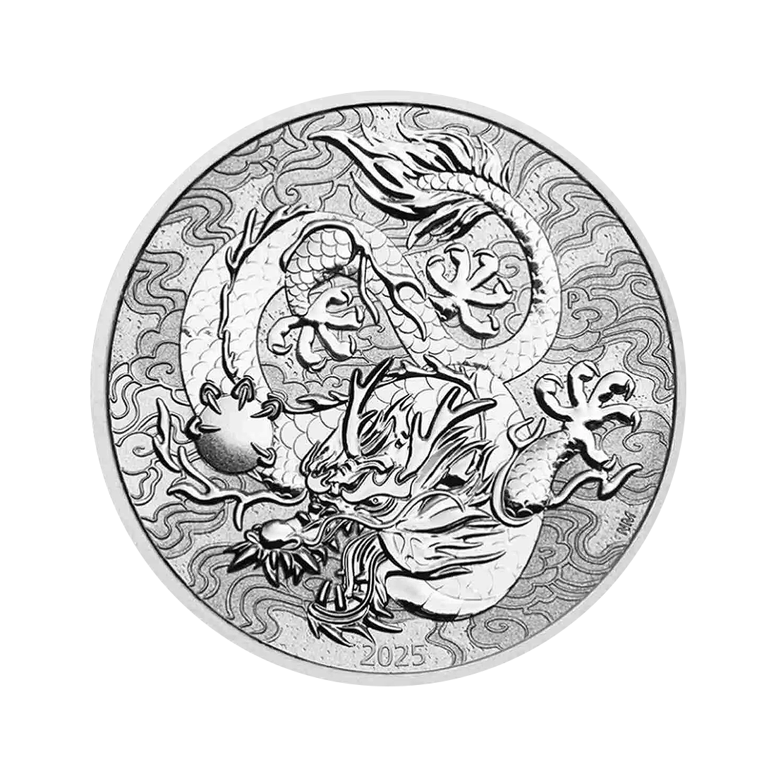 Na rewersie dominuje wizerunek chińskiego smoka – fantastycznego stworzenia wijącego się z gracją na tle chmur i dzierżącego perłę, symbolizującą w tradycji chińskiej szczęście, siłę i bogactwo. Detale łusek, pazurów oraz falującej sylwetki smoka, a także starannie wykonane tło, nadają kompozycji głębię i dynamikę, czyniąc ją zarówno mistyczną, jak i majestatyczną.
