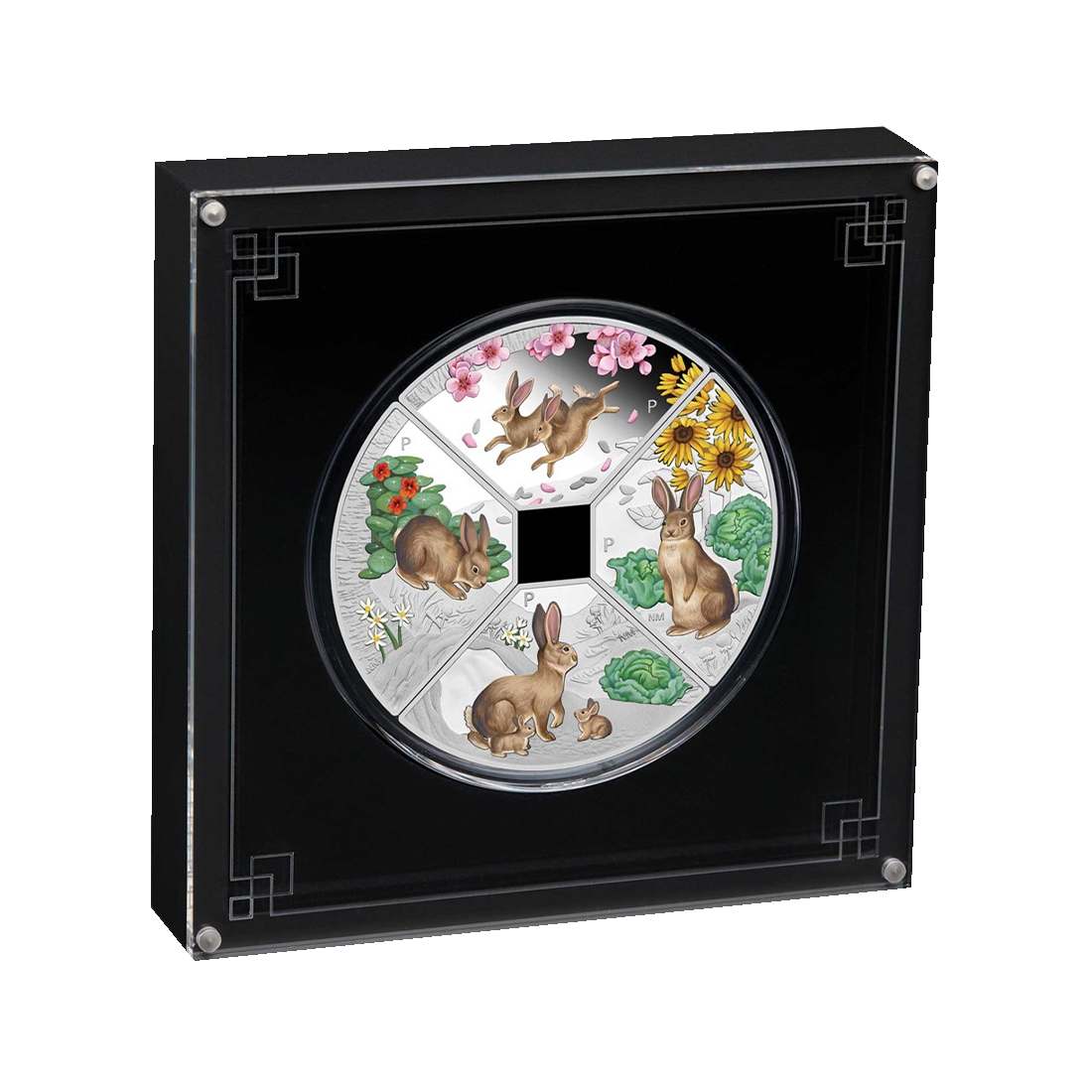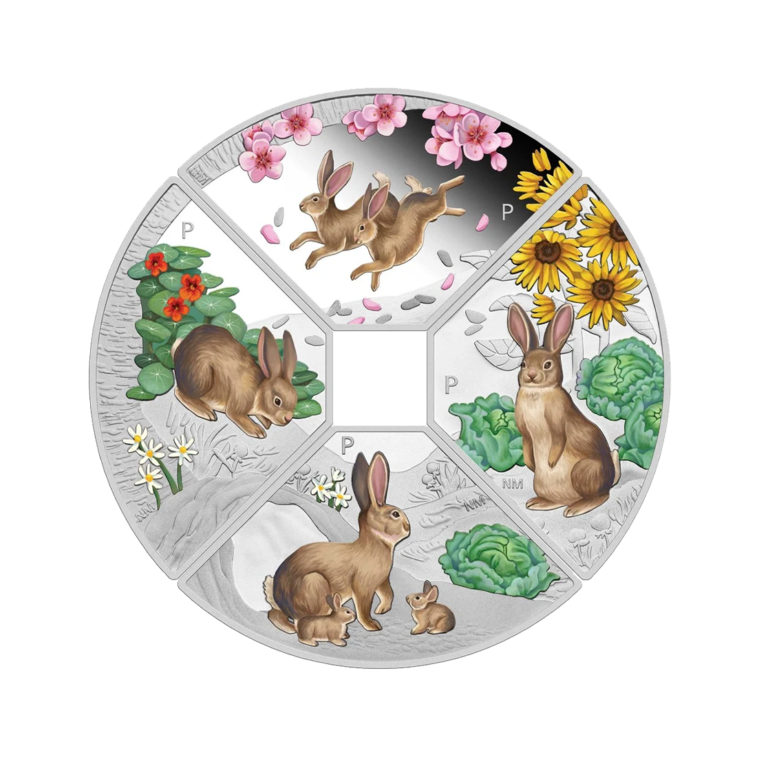 Zestaw kolorowo ilustrowanych 4 srebrnych monet Rok Królika to wybitny produkt kolekcjonersko-inwestycyjny wybity w The Perth Mint. Całość stworzona jest na zlecenie państwa Tuvalu, a co za tym idzie każdy egzemplarz ma gwarancję rządu Tuvalu oraz stanowi legalny środek płatniczy na terenie tego kraju. Zestaw dostarczany jest w ekskluzywnym etui z dołączonym numerowanym certyfikatem autentyczności. Monety wybito czystego srebra próby 999, a każda waży 1 uncję.