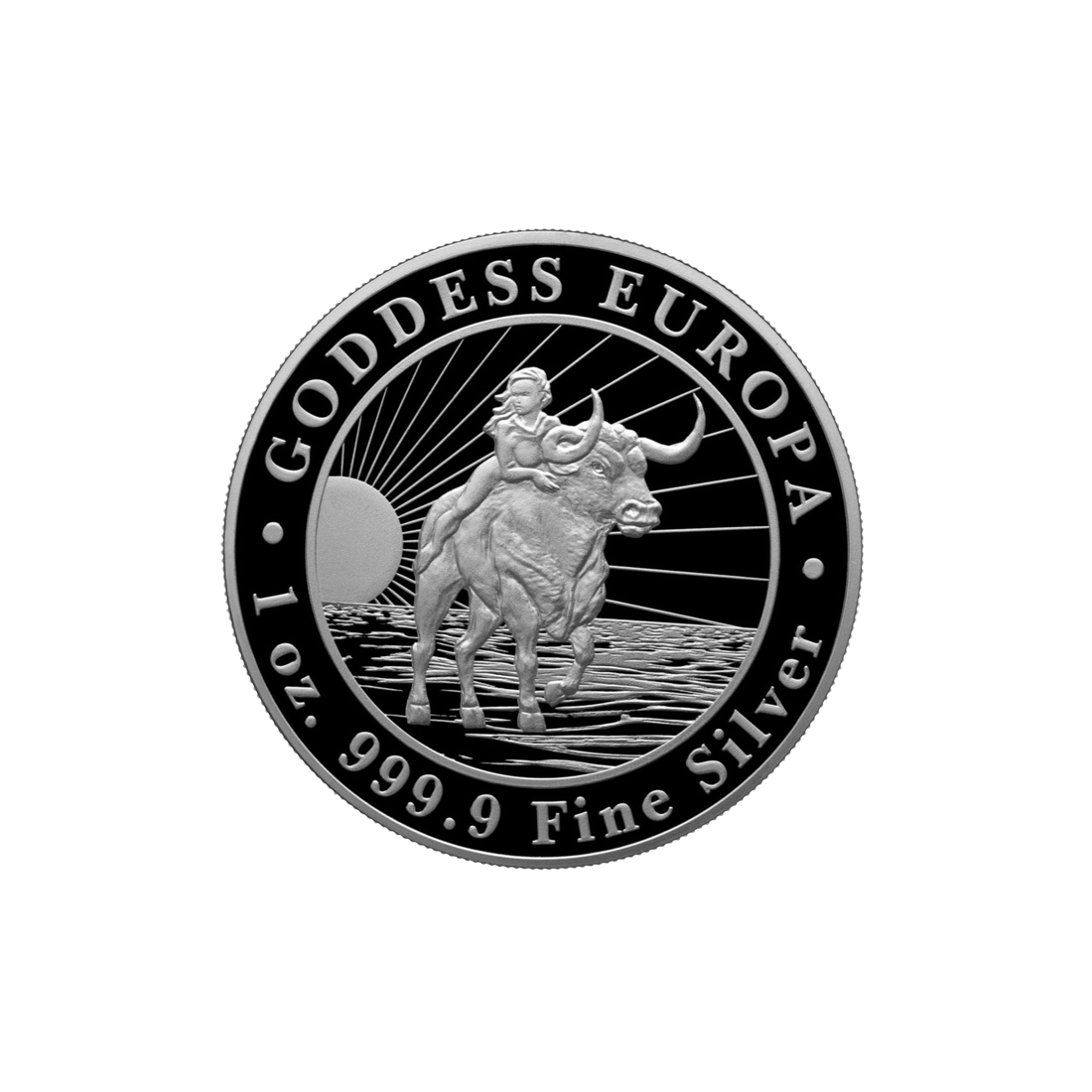 Rewers ukazuje scenę z mitologii greckiej: boginię Europę dosiadającą byka, będącego przemienionym Zeusem. W tle widnieje słońce nad horyzontem, co dodaje dynamiki i głębi kompozycji. Na rewersie umieszczono również napisy "GODDESS EUROPA" oraz informacje o wadze i czystości kruszcu.
