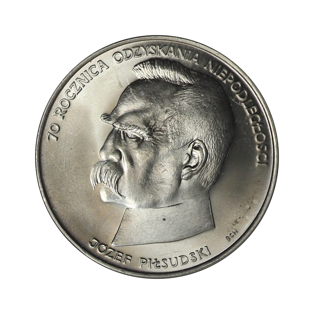 Wyjątkowa pamiątka 70-lecia odzyskania przez Polskę niepodległości, prezentuje klasyczny, elegancki design, który łączy elementy heraldyczne z portretowym przedstawieniem Józefa Piłsudskiego. Na rewersie znajduje się portret twórcy niepodległej Polski - obraz jest wyrazisty i szczegółowy, oddający charakterystyczne cechy twarzy. W dolnej części rewersu umieszczono jego imię i nazwisko, a w otoku znajdują się informacje o roku emisji oraz nominale monety. Awers przedstawia orła bez korony – godło ustanowione dla Polskiej Rzeczpospolitej Ludowej. W otoku monety widnieje nazwa kraju emitującego monetę, a po obu stronach łap orła znajduje się data emisji. Pod orłem umieszczono nominał monety, oddzielony kropkami od pozostałych napisów. Pod lewą łapą orła znajduje się znak mennicy.