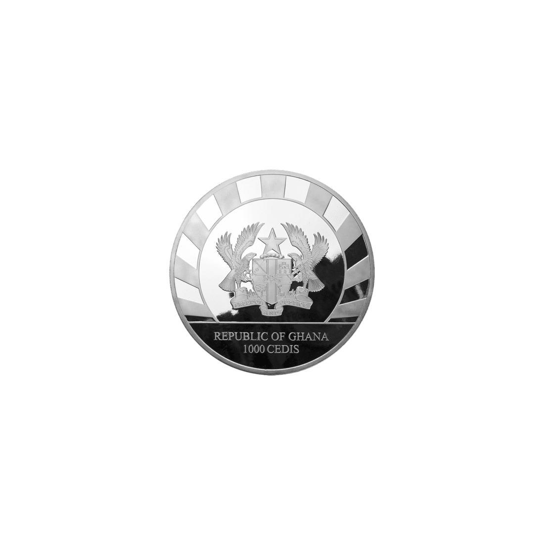 Moneta „Jeleń Olbrzymi” jest drugą odsłoną ambitnej, ośmioczęściowej serii, która ukazuje prehistoryczne zwierzęta z epoki lodowcowej. Rewers monety zdobi wizerunek prehistorycznego zwierzęcia z rodziny jeleniowatych, blisko spokrewnionego ze współczesnym danielem. Sylwetka potężnego jelenia z ogromnym, łopatowatym porożem, wypełnia niemal całą kompozycję. Zwierzę unosi głowę, uchwycone w dynamicznej pozie, na tle łąki i drzew. W otoku umieszczono grawerunki GIANTS OF ICE AGE, informację o masie i czystości kruszcu (1 KG 999 AG) oraz plany całej serii. Awers tradycyjnie przedstawia herb Republiki Ghany, co potwierdza status monety jako prawnego środka płatniczego o nominale 1000 Cedis. Wyjątkowa tematyka i gwarantowana przez rząd Ghany wysoka jakość bicia, za którą odpowiada mennica Leipziger Edelmetallverarbeitung, sprawiają, że egzemplarz ma znaczący potencjał wzrostu wynikający nie tylko z wahań ceny surowca, ale i z walorów numizmatycznych.