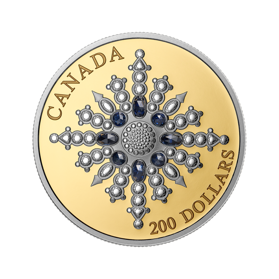 Broszka ta posłużyła jako inspiracja dla monety z urzekającej serii Crown Jewels. Jedyny w swoim rodzaju projekt, wykonany z niezwykłą dbałością o szczegóły, nawiązuje do misternego piękna płatka śniegu, co stanowi symboliczny ukłon w stronę kanadyjskiej Arktyki. Odlany z czystego złota, wygrawerowany wizerunek królewskiej broszki błyszczy zimowym blaskiem, podkreślonym przez osiem olśniewających szafirów w kolorze królewskiego błękitu. Ta inauguracyjna moneta wyznacza początek cenionej kolekcji celebrującej wspaniałość klejnotów koronnych – świadectwa trwałego uroku i prestiżu królewskiego dziedzictwa.