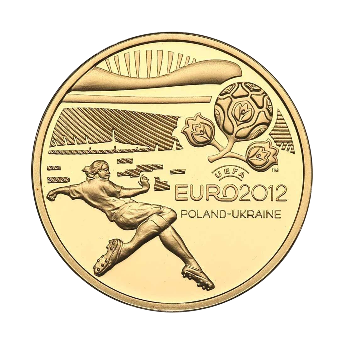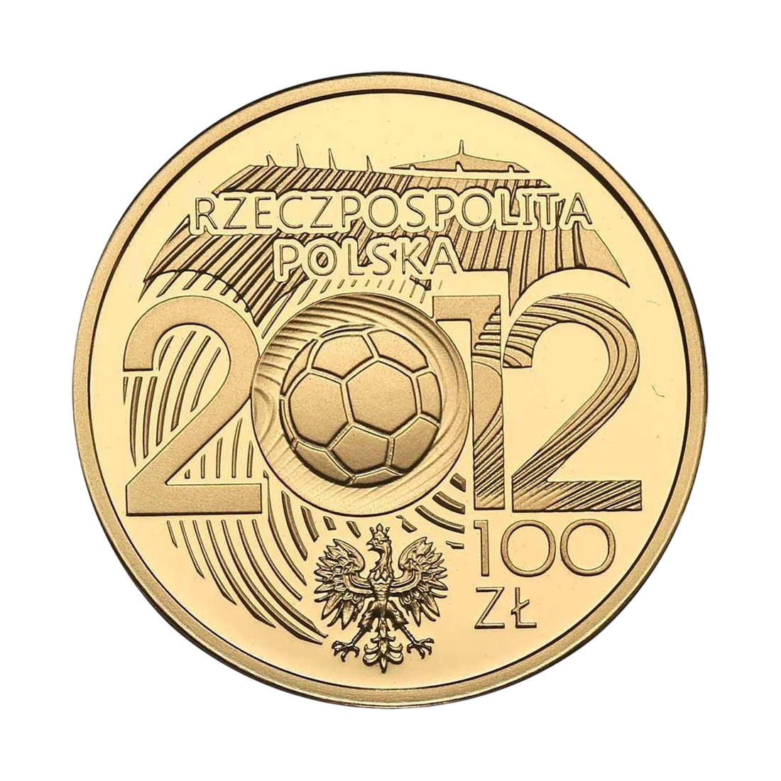 Na awersie monety znalazło się godło Rzeczypospolitej Polskiej – orzeł w koronie – a także napis „RZECZPOSPOLITA POLSKA”, data emisji „2012” oraz nominał „100 ZŁ”. Całość wzbogacona została o graficzny motyw fragmentu stadionu oraz piłkę wpisaną w zero daty. Rewers monety zachwyca sportowym akcentem – przedstawia dynamiczną sylwetkę piłkarza kopiącego piłkę na tle stadionu, a także oficjalne logo UEFA EURO 2012. Projekt ten od razu przyciąga wzrok i czyni monetę wyjątkową wśród złotych emisji kolekcjonerskich.