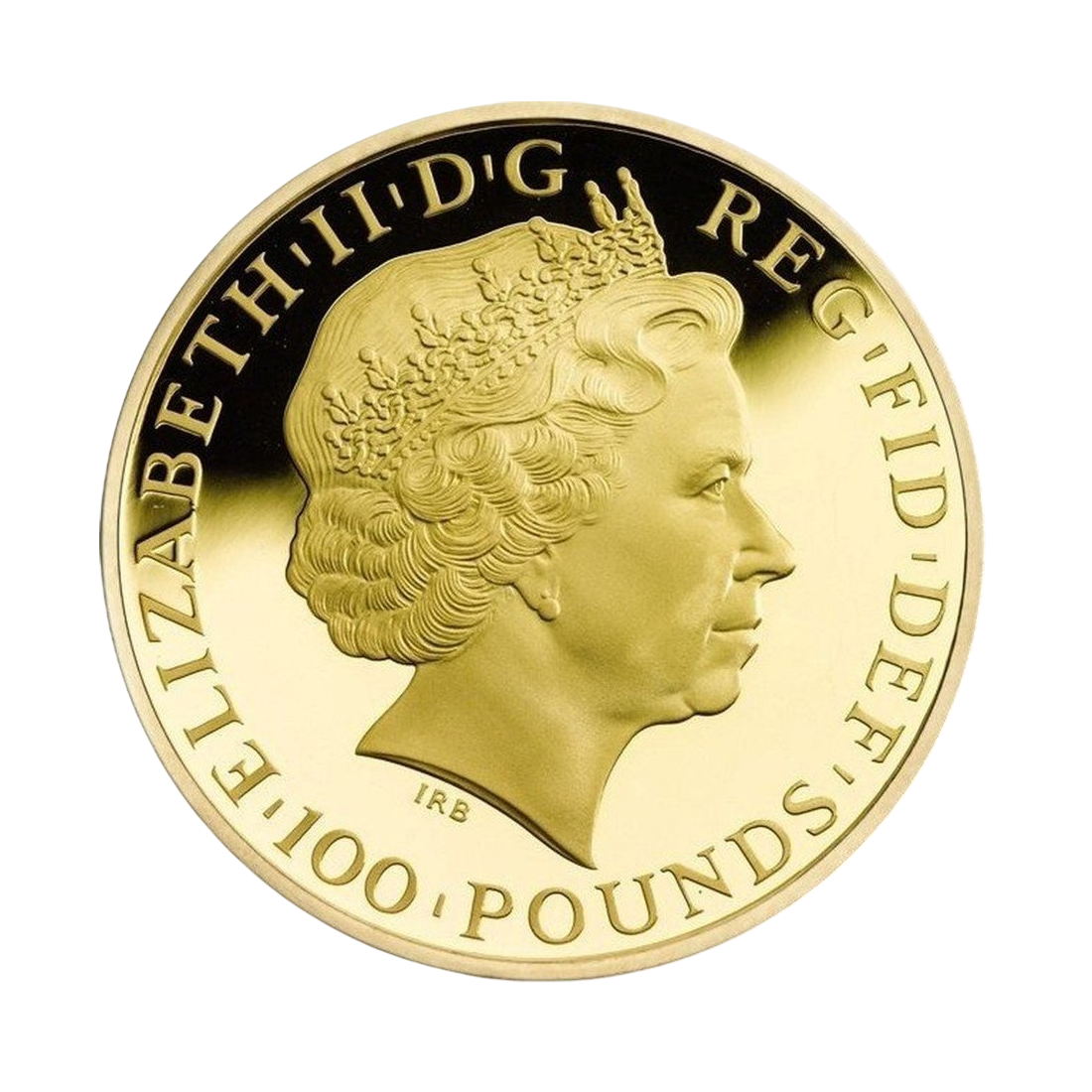 Awers złotej monety prezentuje popiersie królowej Elżbiety II. Wskazano tam również wartość nominalną produktu.
