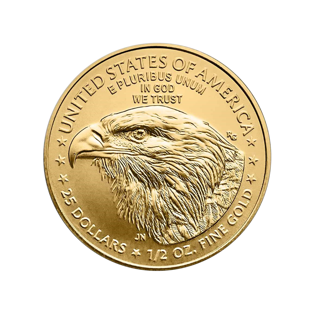 Amerykański Orzeł 1/2 uncji to złota moneta o nominale 25 dolarów amerykańskich, wykonana z 24-karatowego złota z domieszką srebra i miedzi. Wytwarza się ją w Mennicy Stanów Zjednoczonych z kruszcu pochodzącego z lokalnych źródeł.