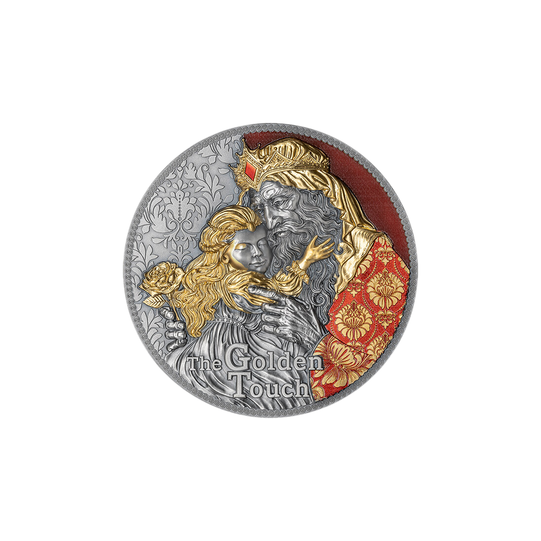 Moneta przedstawia legendarną scenę z mitologii o królu Midasie, którego marzenie o nieograniczonym bogactwie obróciło się w osobistą tragedię. Zastosowanie techniki wysokiego reliefu (High Relief) nadaje detalom trójwymiarową głębię, co w połączeniu z wykończeniem Antique Finish podkreśla historyczny charakter motywu. Selektywne złocenie idealnie oddaje moment, w którym wszystko, czego dotknął król, zmieniało się w złoto, w tym jego ukochana córka. Precyzyjny druk cyfrowy dodaje kompozycji realizmu, tworząc produkt, który wykracza poza ramy zwykłego bilonu, stając się prawdziwym dziełem sztuki menniczej.
