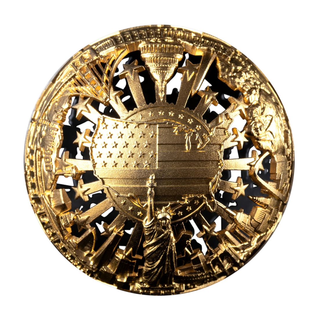 Moneta wyróżnia się wyjątkową konstrukcją filigranową, która nadaje jej lekkości i ażurowego charakteru. Powierzchnia została podzielona na dwie sfery. Pierwsza, pokryta wykończeniem Antique Finish, przedstawia dynamiczne sceny z czasów amerykańskiej wojny o niepodległość, oddając hołd determinacji i poświęceniu rewolucjonistów. Druga część, uszlachetniona selektywnym złoceniem 24-karatowym złotem, ukazuje współczesne symbole wolności i potęgi, takie jak Statua Wolności, most Golden Gate, napis Hollywood czy Empire State Building. Kontrast między antycznym srebrem a blaskiem złota podkreśla ewolucję idei wolności na przestrzeni wieków.