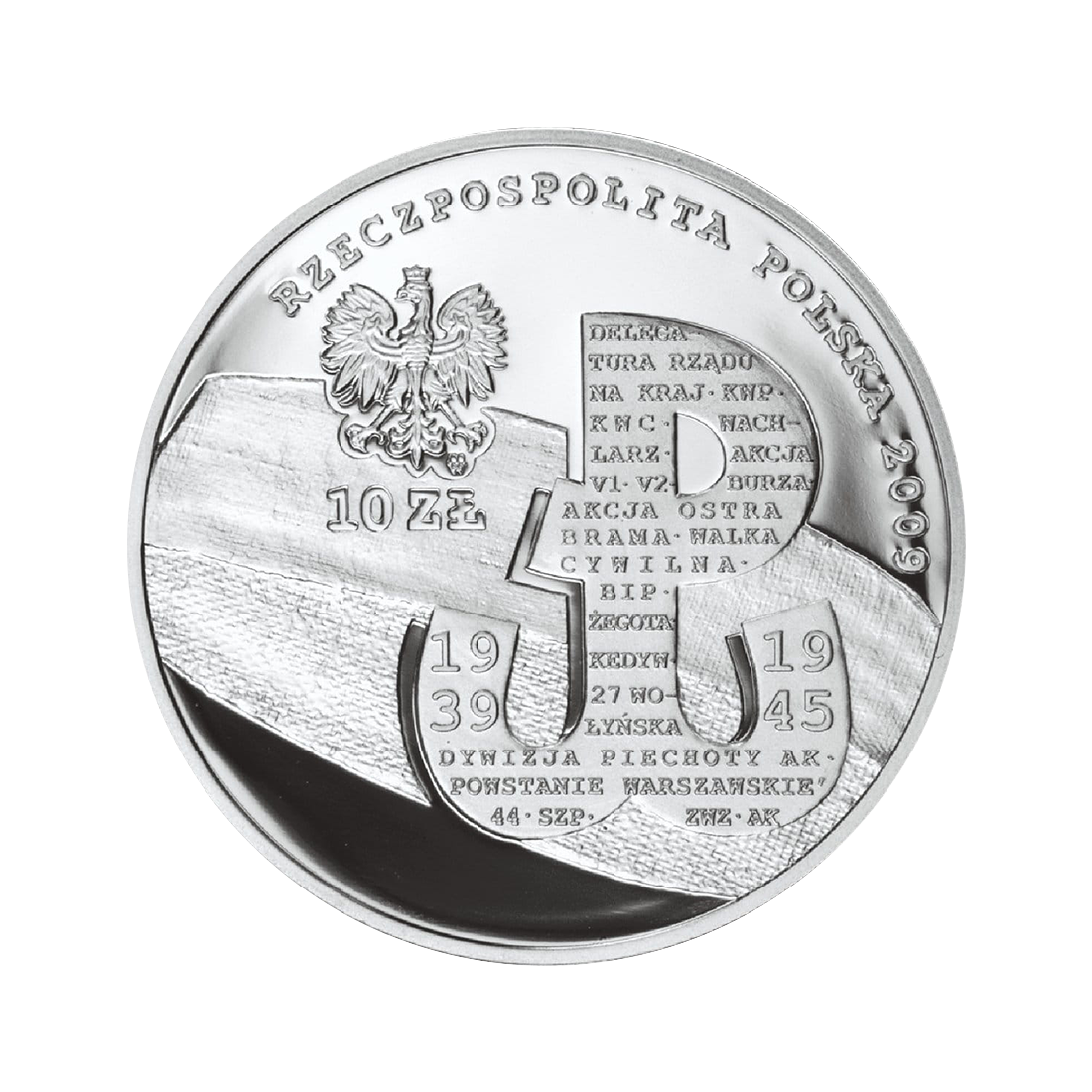 Moneta ma wyraźny charakter narracyjny i historyczny - jej wygląd zewnętrzny łączy symbolikę patriotyczną z czytelną kompozycją, dzięki czemu temat Polskiego Państwa Podziemnego jest bezpośrednio i sugestywnie przekazany. Na rewersie centralnym motywem jest stylizowane popiersie generała dywizji Stefana Roweckiego „Grota”, jednego z najważniejszych przywódców konspiracji w czasie II wojny światowej, w tle, którego widoczny jest fragment znaku Polski Walczącej oraz element opaski powstańczej, co podkreśla kontekst heroicznej walki i ducha narodowego. Wokół tej sceny umieszczono napisy identyfikujące bohaterów konspiracji i upamiętniające działania w latach 1939–1945, co tworzy głęboko symboliczny i historycznie osadzony obraz. Awers monety zachowuje oficjalny, reprezentacyjny styl - dominuje na nim godło Rzeczypospolitej Polskiej w postaci orła, obok którego znajdują się inskrypcje z nazwą państwa, rokiem emisji oraz nominałem, a całość dopełniona jest innymi elementami heraldycznymi i napisem odnoszącym się do Znaku Polski Walczącej, co harmonijnie łączy motyw patriotyczny z formalnym charakterem emisji.