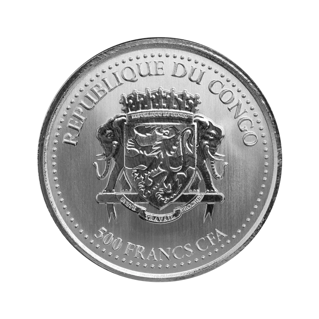 Moneta prezentuje się jako dynamiczny i sugestywny numizmat o wyraźnym, przyrodniczym akcencie. Kompozycja jest czytelna, a zarazem pełna ekspresji, dzięki czemu motyw goryla srebrnogrzbietego natychmiast przyciąga wzrok. Dominujący na rewersie motyw został przedstawiony w naturalistycznej stylistyce, z dużą dbałością o detale anatomiczne oraz wyrazistość ekspresji. Centralnym elementem jest wizerunek dorosłego goryla trzymającego młode, ukazany w charakterystycznej pozie i otoczony elementami opisowymi odnoszącymi się do roku emisji, wagi oraz próby metalu. Całość tworzy mocny, tematyczny punkt narracji. Awers utrzymany jest w klasycznym, oficjalnym stylu reprezentacyjnym. Jego centrum zajmuje herb Republiki Konga jako emitenta, uzupełniony napisami określającymi kraj pochodzenia i nominał. Elementy te rozmieszczono w uporządkowanym układzie na stonowanym tle, co pozwala wyeksponować główne motywy mennicze bez zbędnych elementów rozpraszających uwagę.