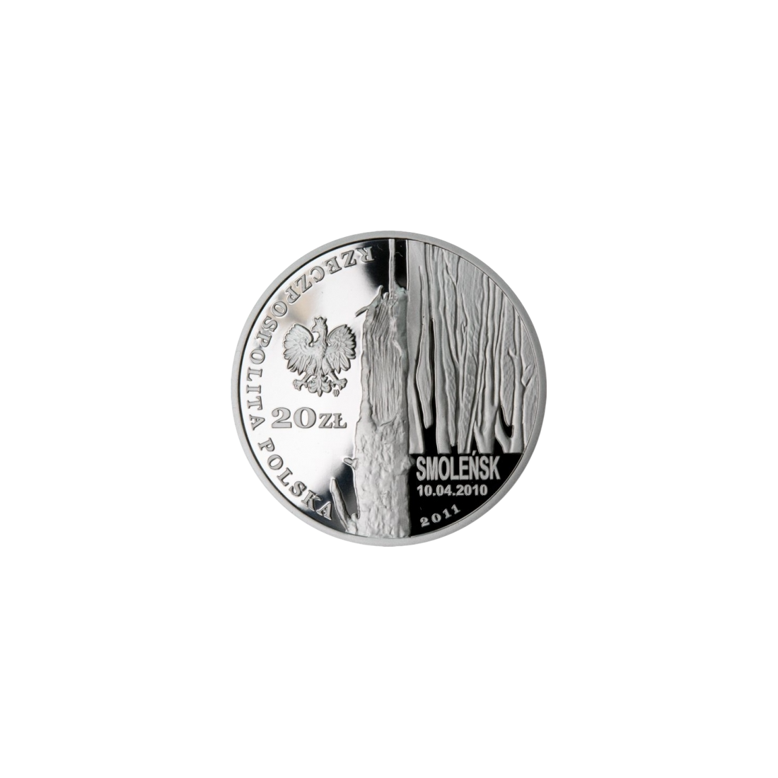 Awers monety przedstawia stylizowany fragment złamanego pnia drzewa, symbolizujący przerwane życie. Po prawej stronie znajdują się stylizowane fragmenty drzew. U dołu widnieje napis: "SMOLEŃSK/10.04.2010", a poniżej półkolem oznaczenie roku emisji: "2011". Po lewej stronie umieszczono wizerunek orła ustalony dla godła Rzeczypospolitej Polskiej, pod którym znajduje się napis: "20 ZŁ". Na lewo od orła półkolem widnieje napis: "RZECZPOSPOLITA POLSKA". Pod lewą łapą orła znajduje się znak mennicy: M/W.