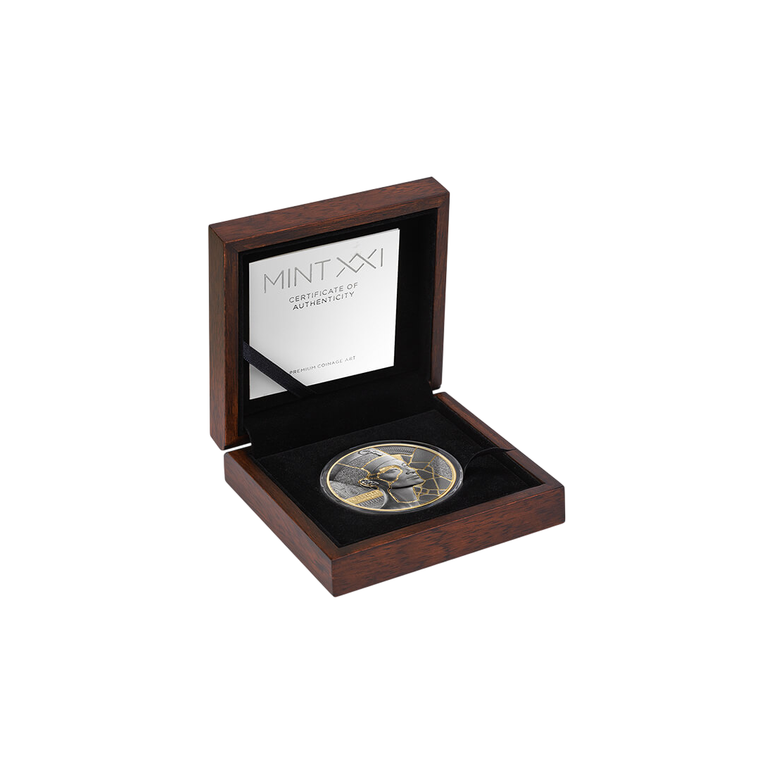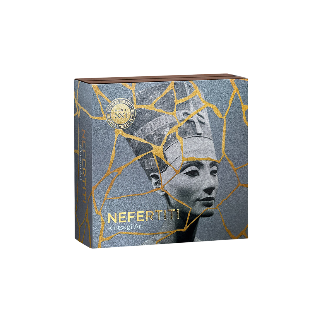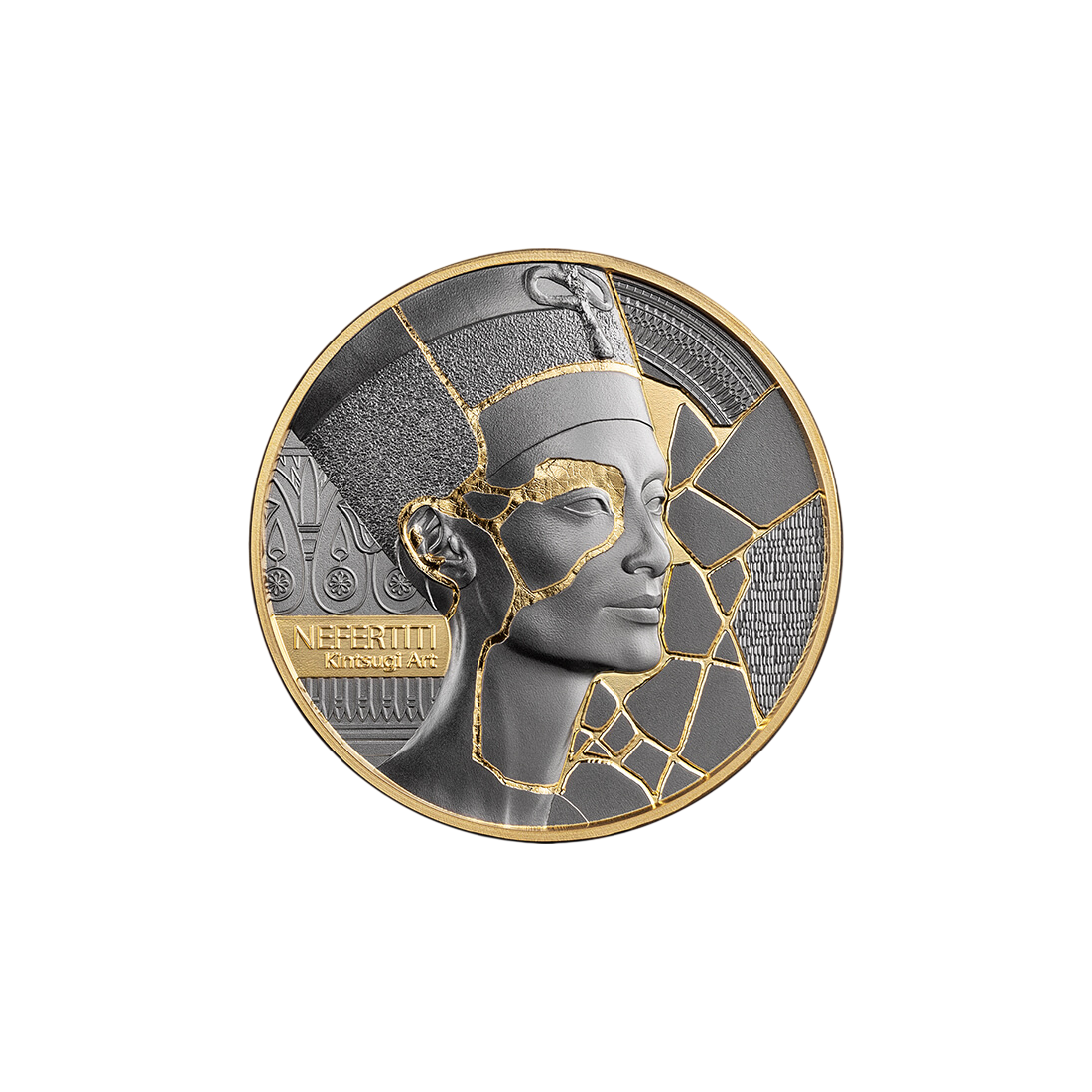 Kintsugi to japońska sztuka naprawy potłuczonej ceramiki za pomocą laku z dodatkiem metali szlachetnych. W tym wydaniu technika ta staje się metaforą siły i nowego życia, które rodzi się z doświadczonych pęknięć. Na monecie wizerunek królowej Nefertiti został ozdobiony selektywnym złoceniem, które imituje te szlachetne spoiny. Symbolizuje to, że historia i przebyte trudności nie obniżają wartości, lecz wręcz ją podnoszą, nadając całości unikatowy charakter.