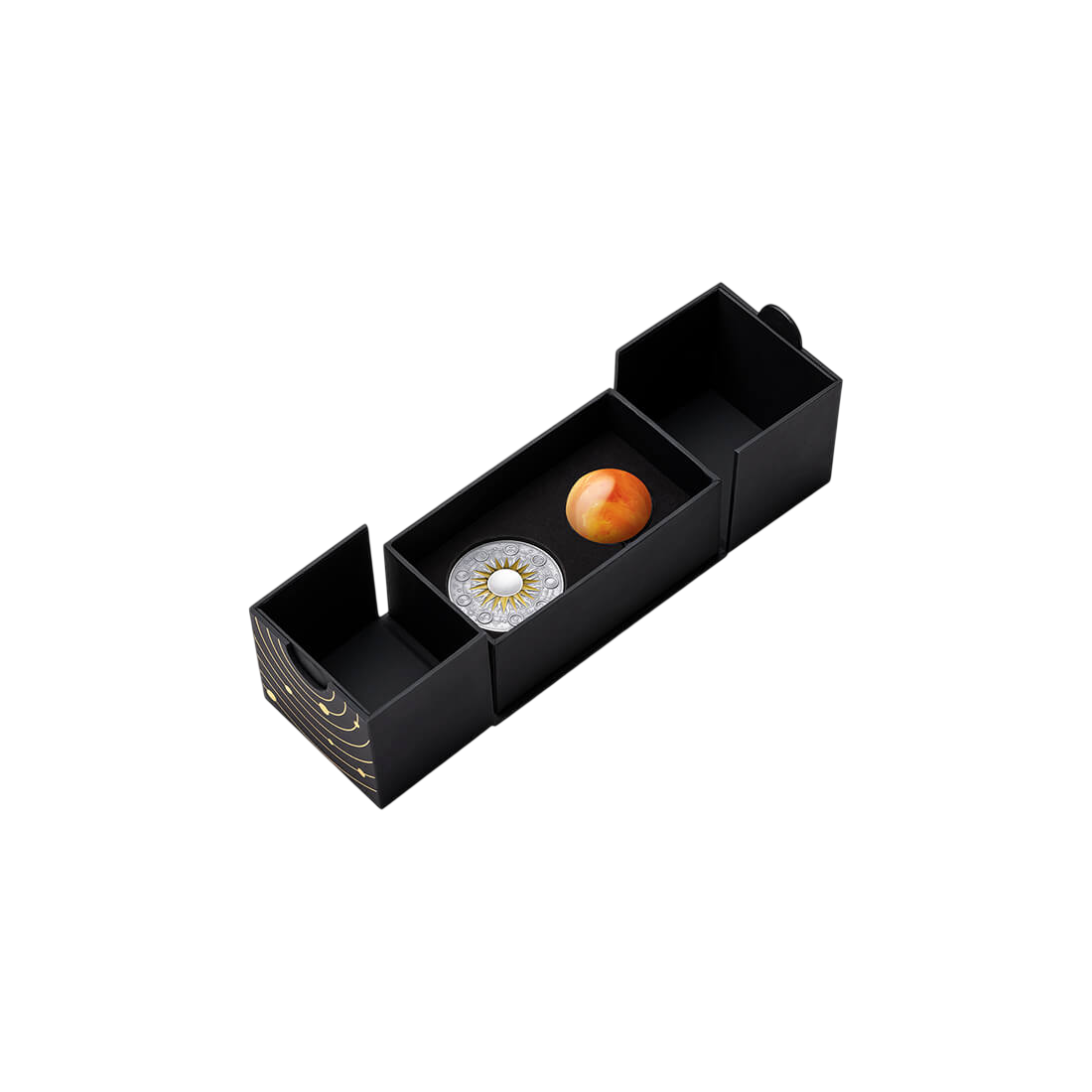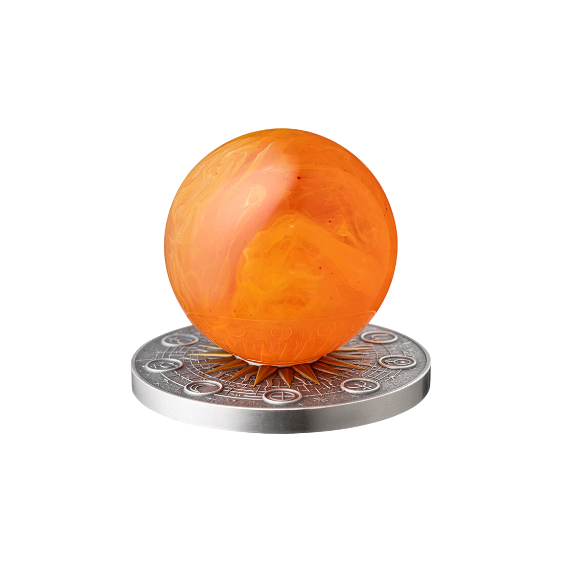 Moneta wyróżnia się zastosowaniem nowoczesnych technik menniczych, które nadają jej niepowtarzalny charakter. Rewers przedstawia centralny punkt naszego układu – Słońce, które zostało wyeksponowane dzięki zastosowaniu wstawki z prawdziwego bursztynu. Wykorzystanie tego naturalnego surowca idealnie oddaje energię i barwę gwiazdy. Całość zdobi efektowne wykończenie Antique Finish, które podkreśla głębię detali i nadaje numizmatowi szlachetny wygląd. Reliefy ukazujące orbitujące planety zostały wykonane z najwyższą precyzją, co czyni produkt atrakcyjnym dla najbardziej wymagających estetów.