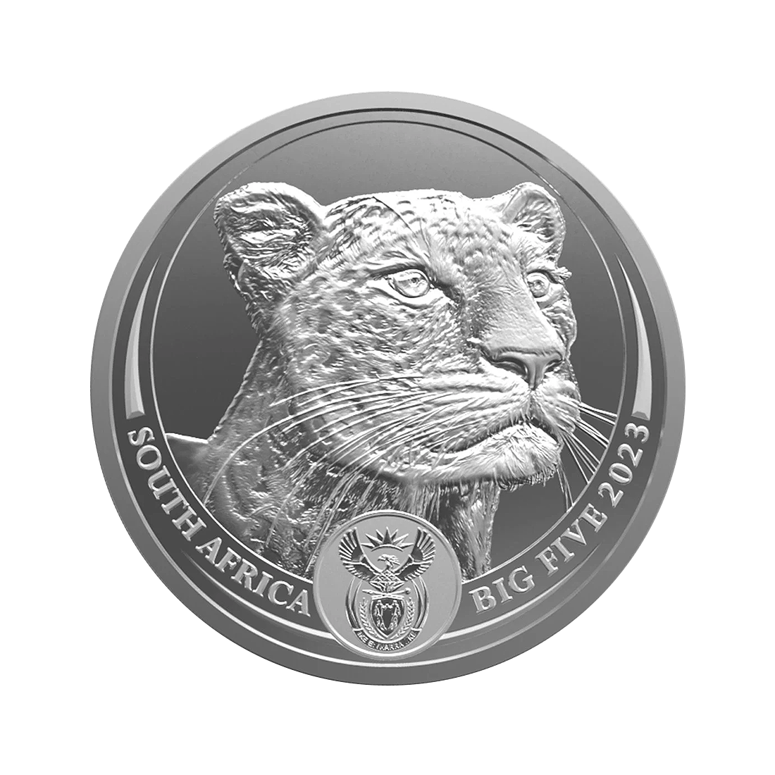 Awers prezentuje pełny profil głowy lamparta skierowany w bok, otoczony napisami identyfikującymi kraj emisji, a poniżej umieszczono symbol państwowy Republiki Południowej Afryki, co dodaje tej stronie oficjalnego charakteru oraz łączy ją z tradycją numizmatyczną emitenta. Cała kompozycja obu stron zestawia artystyczne przedstawienie tematu przyrodniczego z formalnym układem identyfikacyjnym, dzięki czemu moneta jest zarówno atrakcyjna wizualnie, jak i jasno kojarzy się z kulturą i dziedzictwem Afryki reprezentowanym przez gatunek lamparta.