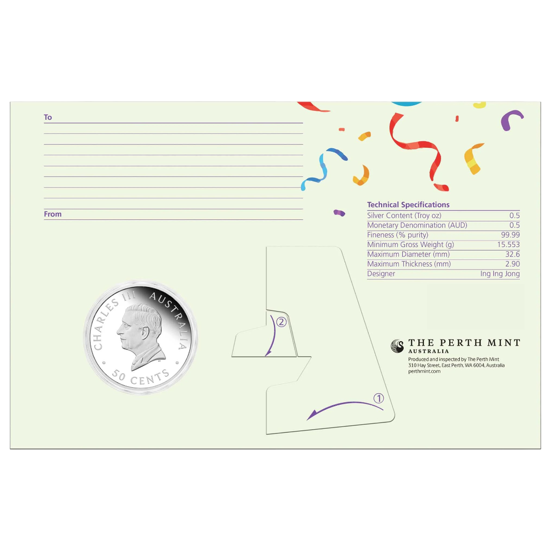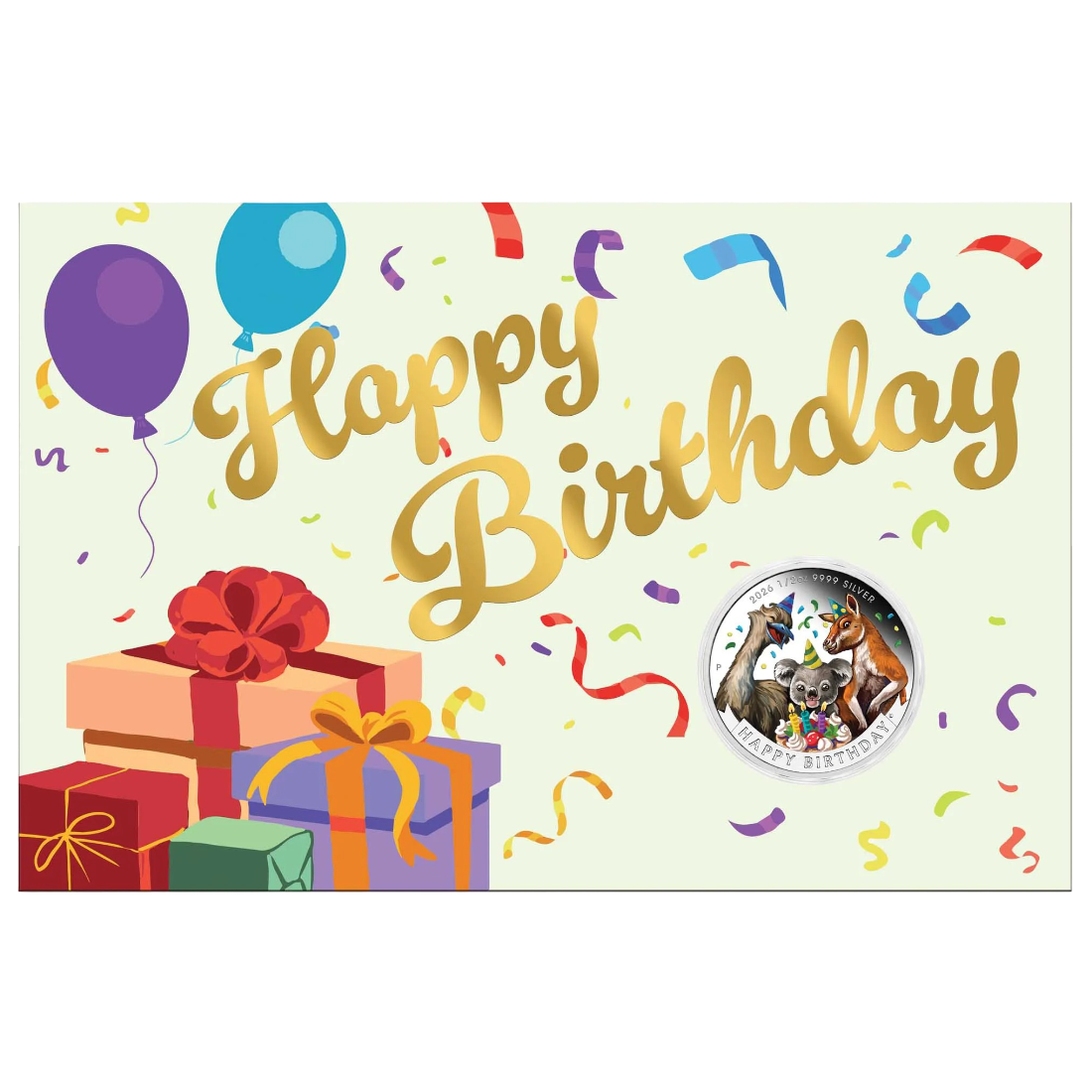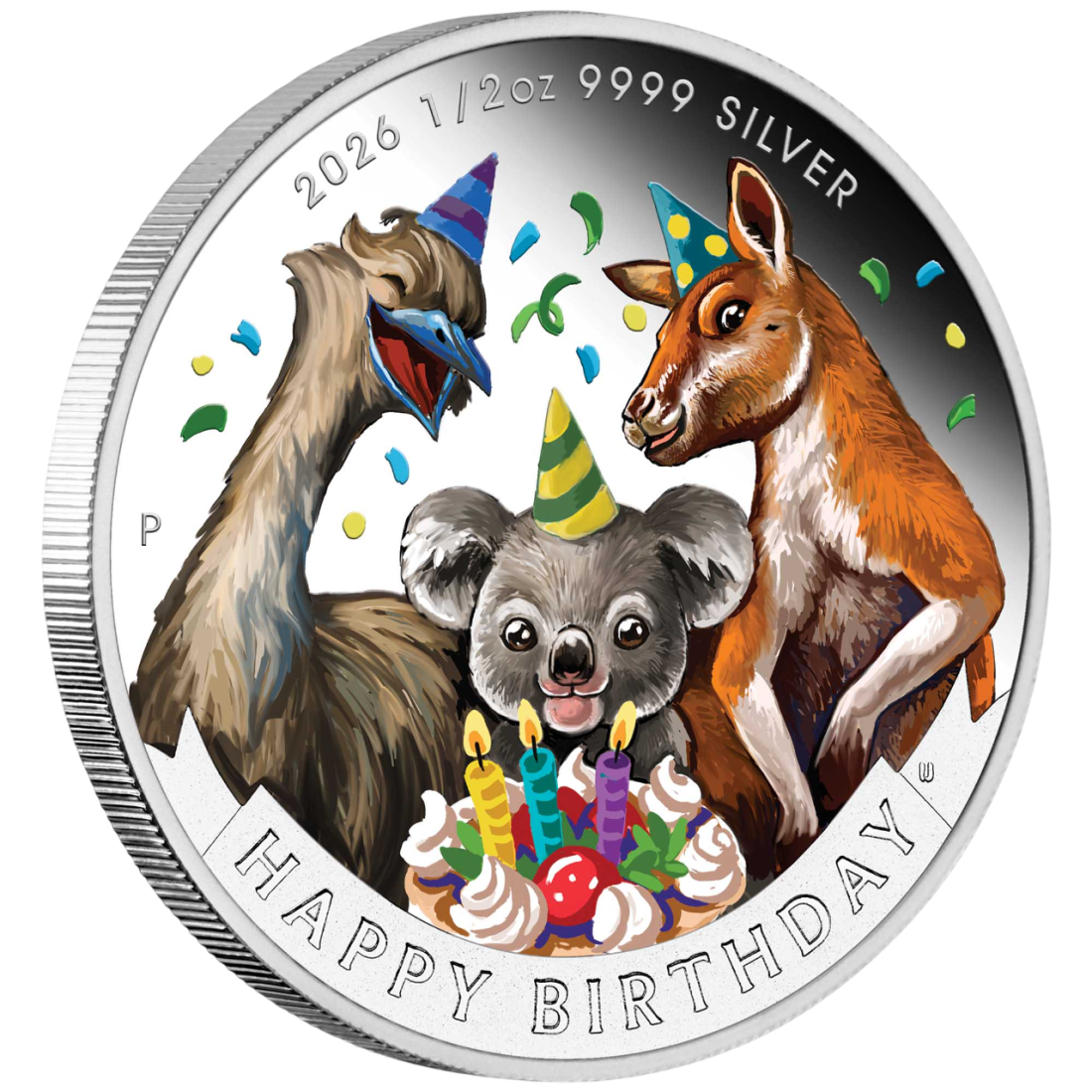 Rewers monety przyciąga wzrok barwną, radosną grafiką przedstawiającą symbole australijskiej fauny – emu, koalę oraz kangura. Zwierzęta te zostały ukazane w świątecznej scenerii przy urodzinowym torcie, co w połączeniu z kolorowymi konfetti tworzy niezwykle estetyczną kompozycję. Napis „HAPPY BIRTHDAY” oraz znak menniczy „P” dopełniają całości, podkreślając kolekcjonerską wartość produktu. Awers zdobi wizerunek Jego Królewskiej Mości Króla Karola III, co nadaje monecie status oficjalnego środka płatniczego Australii.