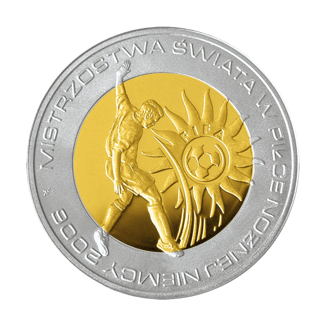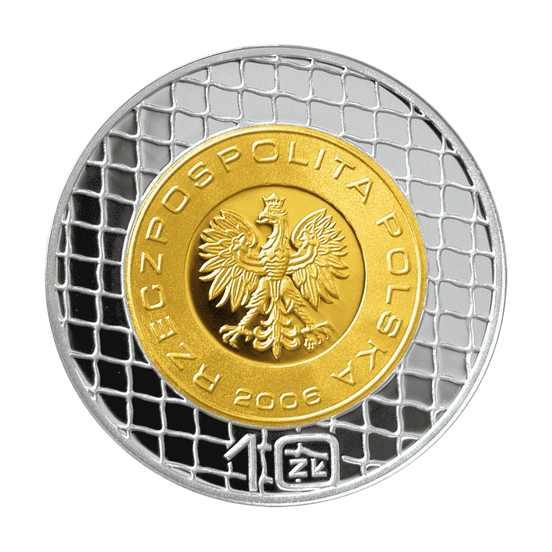 Moneta została wybita w srebrze próby 925, co gwarantuje jej trwałość i szlachetny wygląd. To, co szczególnie przyciąga uwagę, to zastosowanie techniki platerowania złotem najwyższej próby 999. Złocenie obejmuje centralną część monety, tworząc efektowny kontrast z lśniącym srebrnym pierścieniem. Projekt autorstwa Roberta Kotowicza zachwyca dynamiką – na rewersie widnieje stylizowany wizerunek piłkarza w momencie oddawania strzału, a w tle widać piłkę w locie otoczoną promieniami. Awers monety tradycyjnie zdobi godło Rzeczypospolitej Polskiej, osadzone na tle imitującym siatkę bramki, co spójnie nawiązuje do tematyki sportowej.