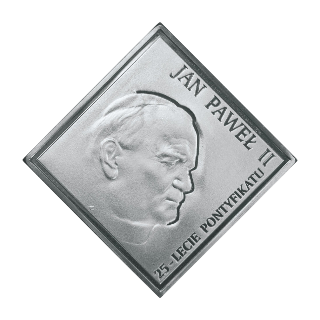 Projekt monety, autorstwa wybitnej artystki Ewy Tyc-Karpińskiej, zachwyca subtelnością i głębią przekazu. Rewers przedstawia wiernie oddany, pełen spokoju portret Jana Pawła II, któremu towarzyszą napisy upamiętniające jubileusz 25-lecia pontyfikatu. Awers monety to dynamiczna kompozycja ukazująca sylwetkę papieża wspartego na pastorale, umieszczoną na tle stylizowanych gałęzi, co nadaje całości charakteru podniosłego i symbolicznego. Kwadratowa forma monety o wymiarach 40 na 40 mm pozwala na lepszą ekspozycję tych detali, czyniąc ją obowiązkowym elementem każdej zaawansowanej kolekcji numizmatycznej.
