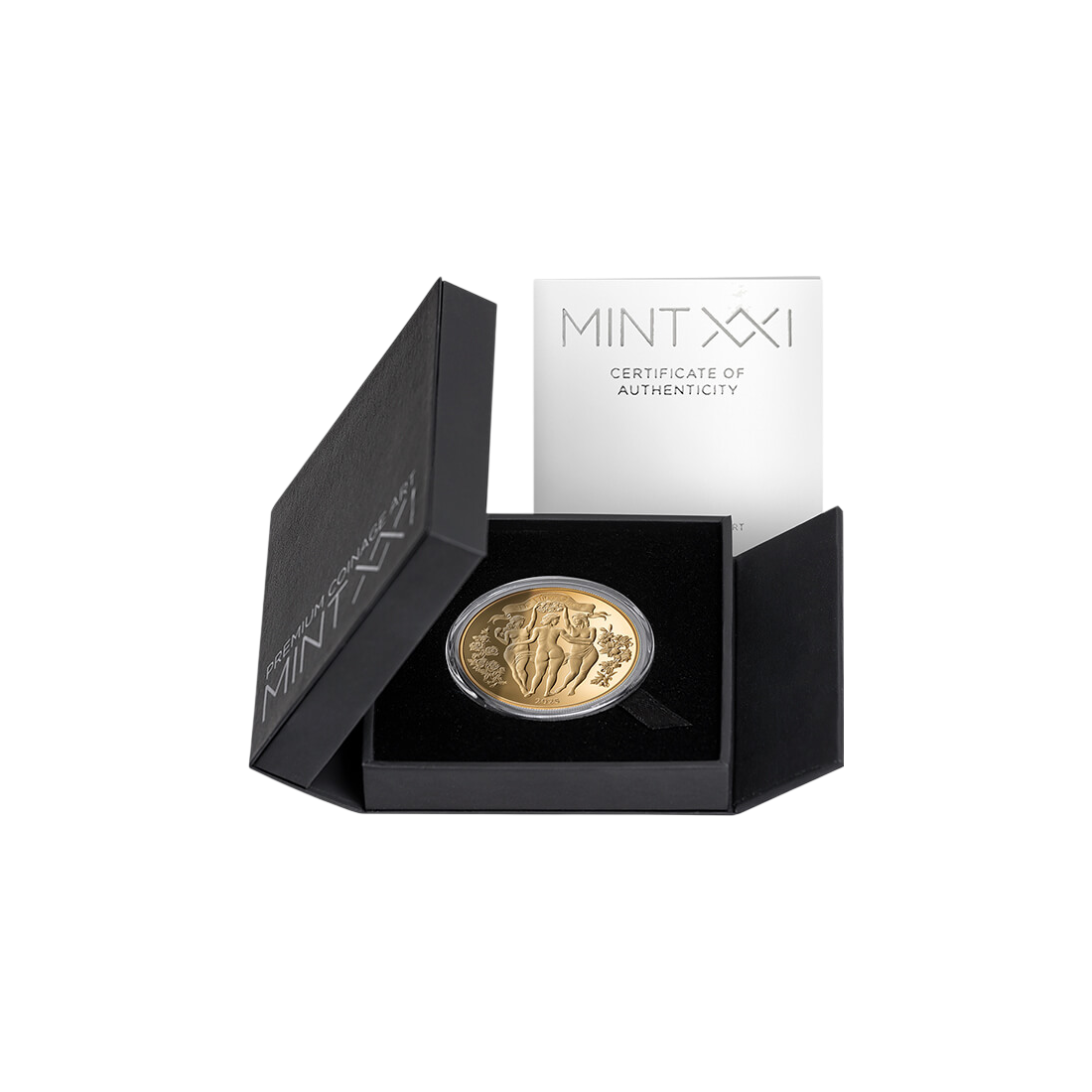 Najważniejszym atutem tej emisji jest jej ekskluzywne wykończenie. W przeciwieństwie do standardowych monet, wersja Golden Edition charakteryzuje się tym, że cała powierzchnia srebra próby 999 została precyzyjnie pokryta warstwą czystego złota. Takie rozwiązanie nadaje monecie jednolity, głęboki blask i podkreśla jej luksusowy charakter. Zastosowanie technologii wysokiego reliefu sprawia, że postacie Trzech Gracji niemal wychodzą z płaszczyzny monety, a złota powłoka doskonale eksponuje każdy, nawet najdrobniejszy detal rzeźbiarski. Dla inwestora pełne złocenie jest gwarancją unikatowości produktu, co znacząco podnosi jego atrakcyjność na rynku wtórnym i ułatwia późniejszą odsprzedaż z wysoką marżą.