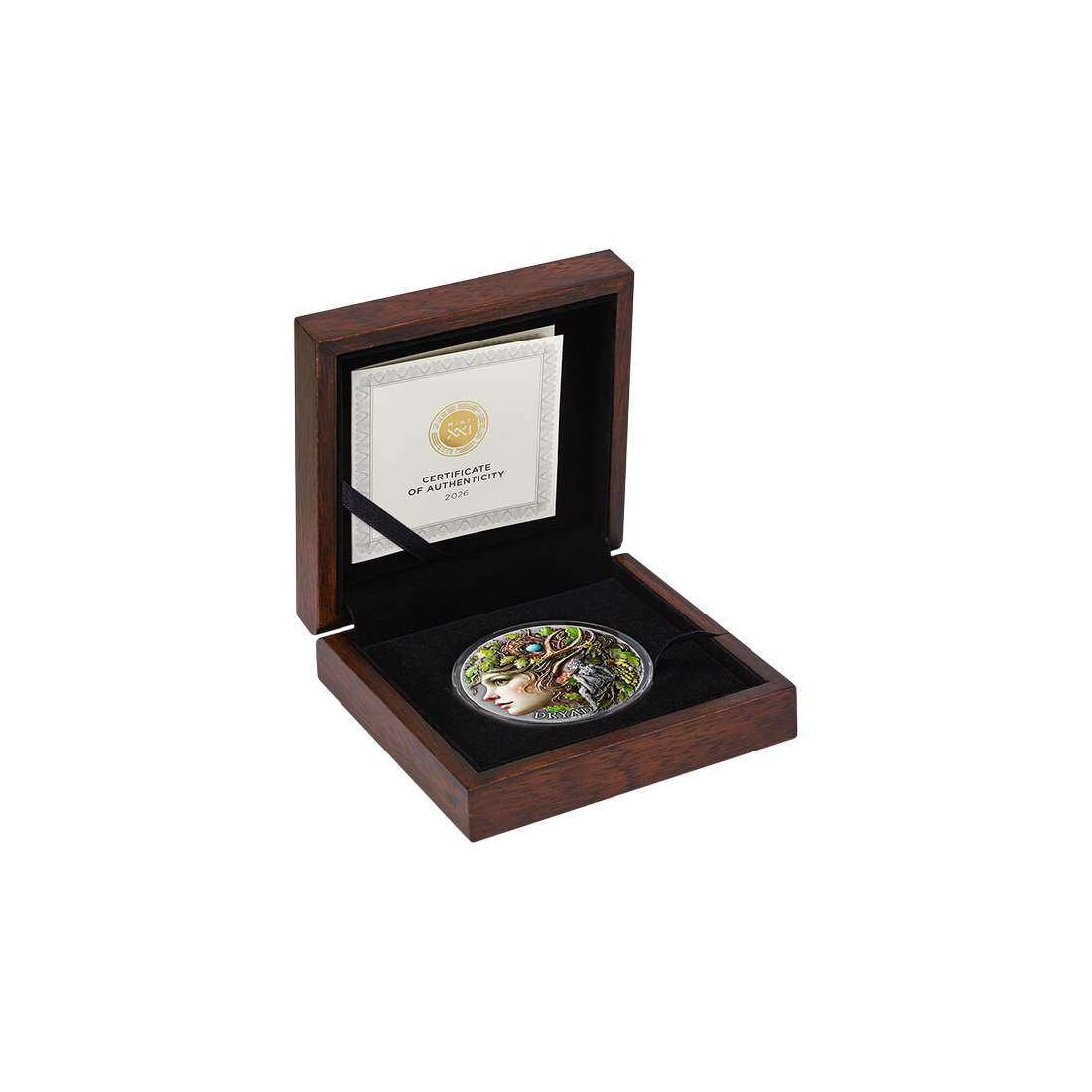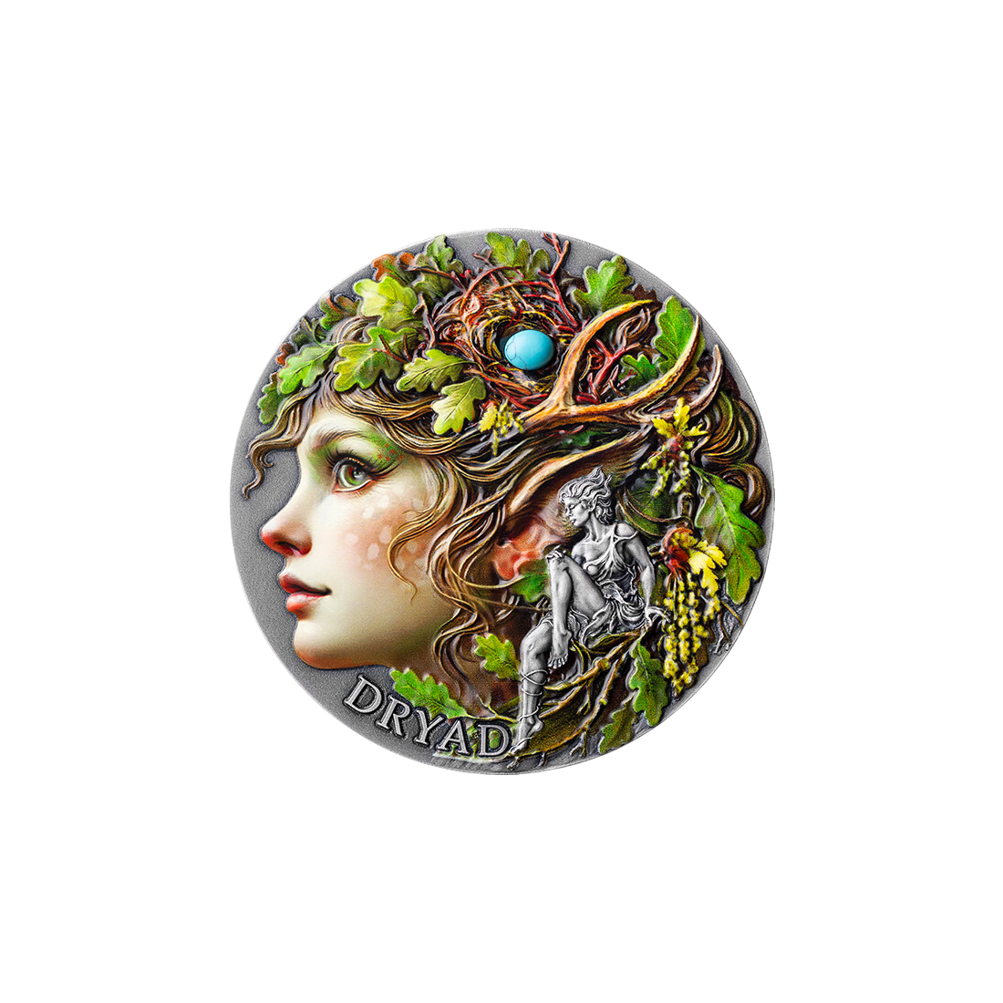 Rewers monety przedstawia eteryczną postać Driady – mitycznej opiekunki lasów, której sylwetka płynnie przechodzi w splot gałęzi i liści. Dzięki zastosowaniu wysokiego reliefu (High Relief), kompozycja zyskuje trójwymiarową głębię, która niemal ożywia postać strażniczki natury. Precyzyjne detale zostały podkreślone wykończeniem typu Antique Finish, nadającym całości szlachetny, historyczny charakter. Dodatkowym atutem jest selektywny druk cyfrowy, który wprowadza subtelne barwy, oraz wstawka z kamienia szlachetnego (Gem Insert), połyskująca wśród korzeni niczym ukryty skarb.