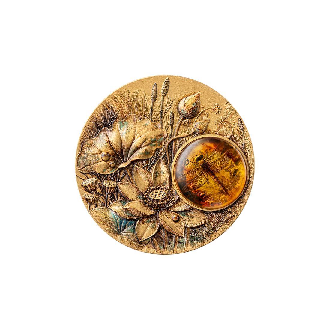 Głównym motywem monety jest ważka – symbol transformacji i lekkości, która została uwieczniona w botanicznym otoczeniu pełnym detali. Zastosowanie technologii wysokiego reliefu pozwala na wydobycie faktury liści i płatków kwiatów z niemal fotograficzną precyzją. Centralnym punktem kompozycji jest wstawka z autentycznego bursztynu, w której – dzięki technice druku cyfrowego oraz selektywnemu złoceniu – postać ważki sprawia wrażenie zatrzymanej w czasie, niczym inkluzja w żywicy. Wykończenie typu Antique Finish nadaje całości szlachetny, surowy charakter, doskonale kontrastujący z ciepłym blaskiem bursztynu i złota.