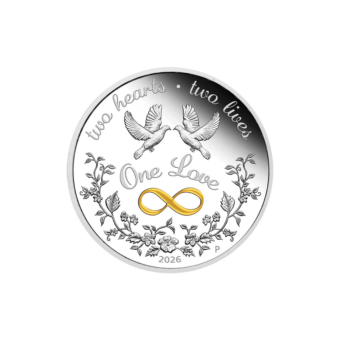 Rewers monety One Love 2026 przyciąga wzrok misternie dopracowanymi detalami, które niosą ze sobą głęboki przekaz. Centralnym punktem kompozycji są dwa gołębie, symbolizujące pokój i harmonię, zbliżające się do siebie nad złoconym symbolem nieskończoności. Całość otacza delikatna girlanda z kwiatów oraz napisy „two hearts • two lives” i „One Love”. Wykorzystanie techniki selektywnego złocenia oraz matowych i lustrzanych powierzchni (standard proof) podnosi walory estetyczne produktu, czyniąc go pożądanym obiektem na rynku wtórnym. Precyzja, z jaką oddano pióra ptaków czy subtelne pnącza roślin, świadczy o najwyższym standardzie menniczym.