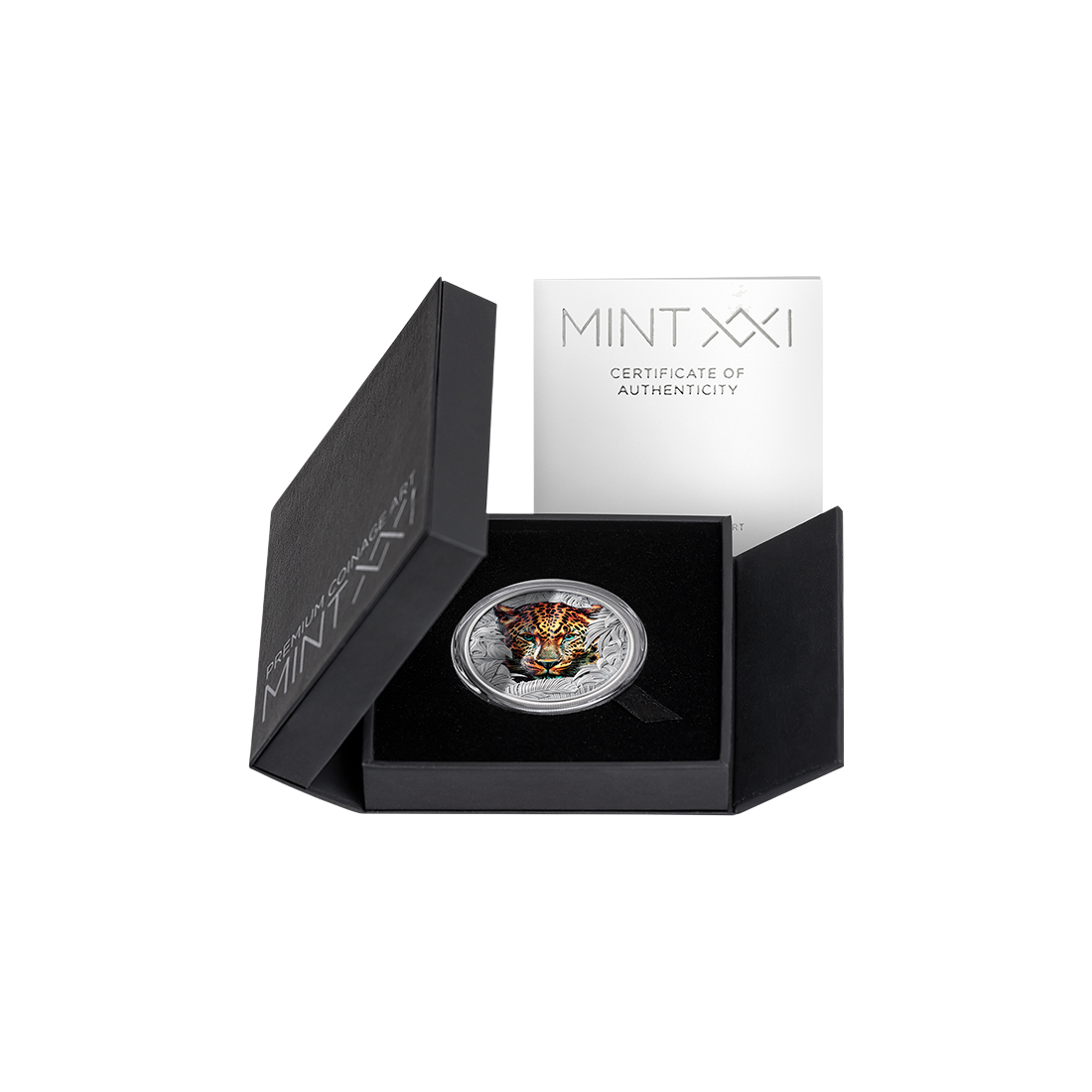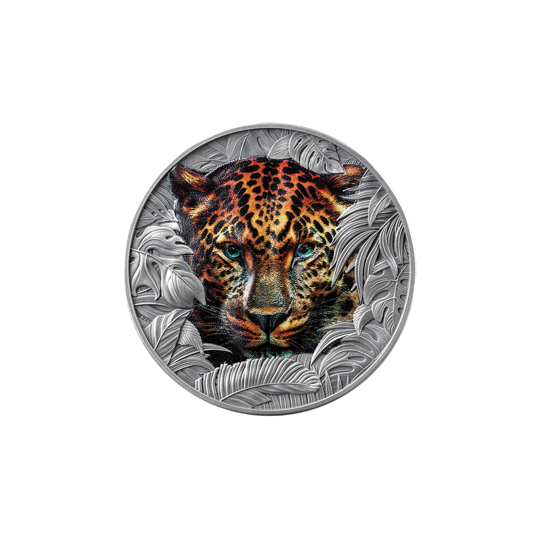 To, co wyróżnia produkt na tle standardowych monet bulionowych, to niespotykana dbałość o detale. Wykorzystanie technologii wysokiego reliefu (High Relief) sprawia, że wizerunek lamparta wyłaniającego się z gęstwiny roślinności jest niemal trójwymiarowy. Realizm potęguje zastosowanie precyzyjnego druku cyfrowego, który nadaje drapieżnikowi naturalne barwy i hipnotyzujące spojrzenie. Całość została wykończona w standardzie Antique Finish, co nadaje monecie szlachetny, postarzany wygląd i chroni jej powierzchnię, podkreślając jednocześnie każdy szczegół grawerunku.